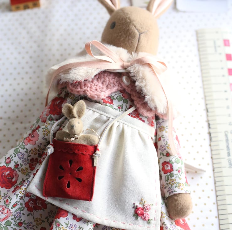 Her accessories include a tiny leather bag, hand punched with a daisy design and containing a baby bunny with a ric rac tie.