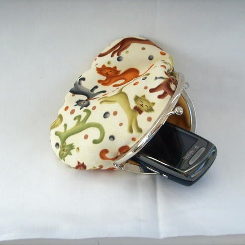 Perfect little purse for your keys, change and credit cards. Colourful cats fabric with contrasting lining, padding and metal frame clasp.