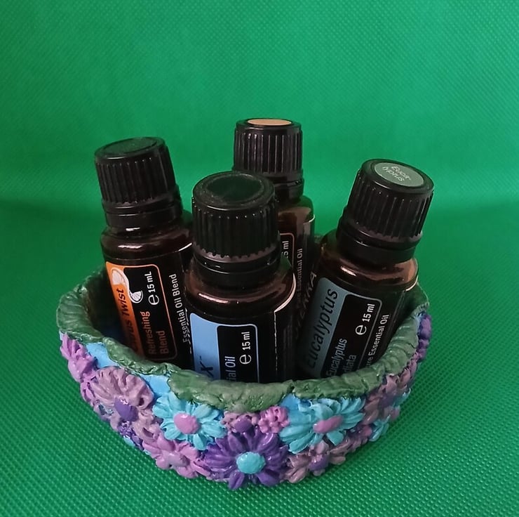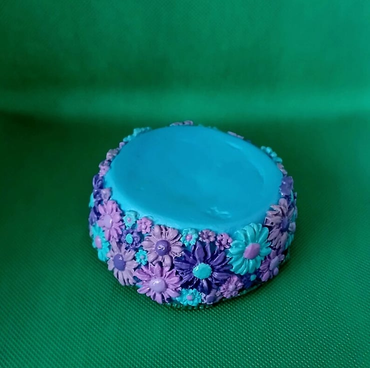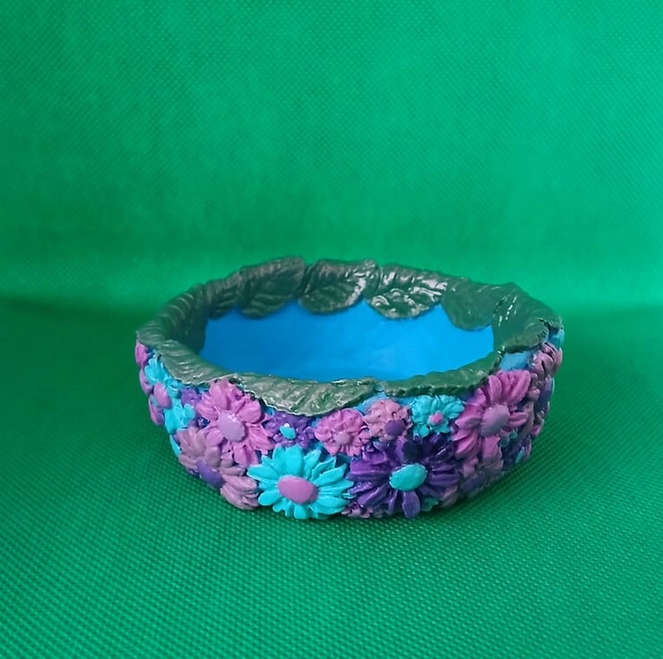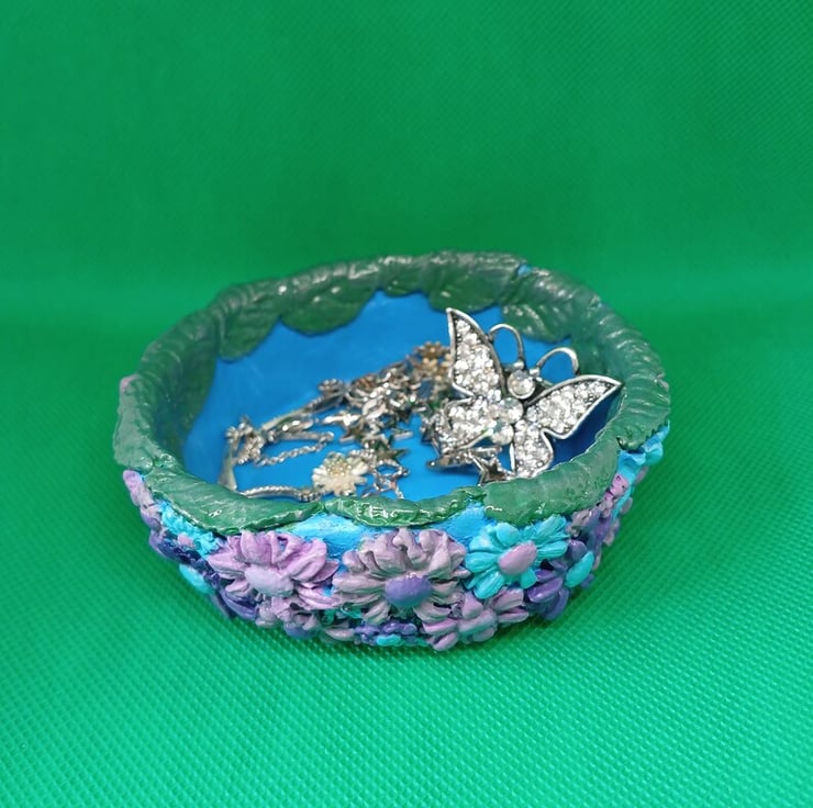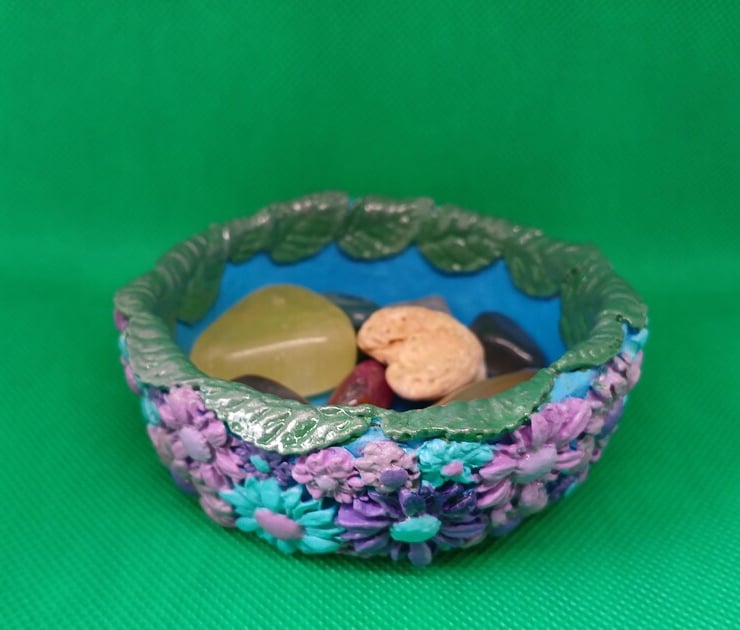 I love flowers and made this gorgeous pot using flower moulds and handmade leaves, in gorgeous shades of purples and blues. This pot would make a lovely gift for a loved one or friend and is perfect for keeping items in such as jewellery, essential oils, crystals or any special things.