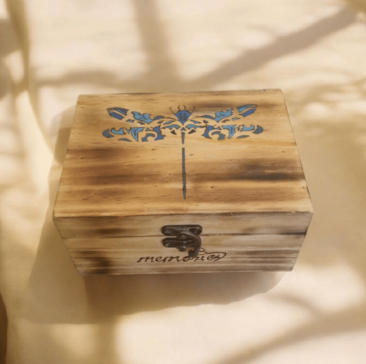 This has been heat treated and a colourful dragonfly added to the top using the art of pyrography then coloured with acrylic paint.