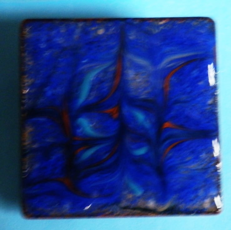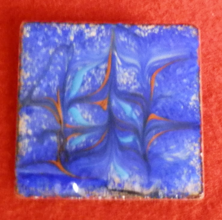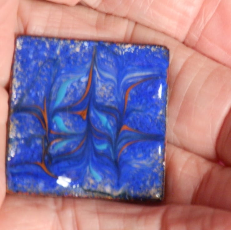 I have built up layers of transparent enamel over the copper base, then added a layer of dark blue. I have then scattered small pieces of turquoise enamel rod and bright red enamel rod on the dark blue and generated the pattern you see by drawing a steel tip through the enamel while it was red hot, in the kiln. The copper base is not fully covered by the coloured enamels and may also be exposed by the action of the steel tip, so shows golden brown in the pattern. The various colours are all red hot at this stage and that factor and the imminent setting of the enamel as it cools introduces an element of randomness and therefore individuality to the finished piece.