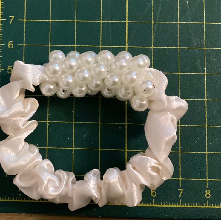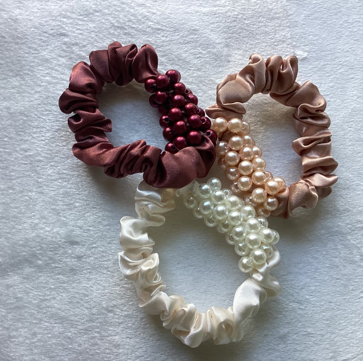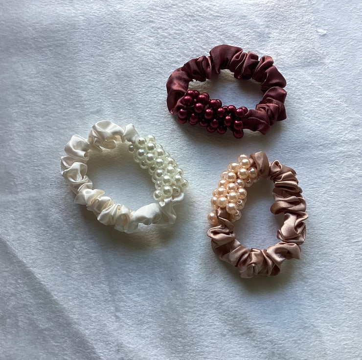 Set of 3 mini satin elasticated scrunchies, decorated with small beads. Measurement in cm.