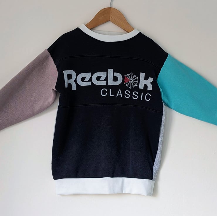 A fun children's sweatshirt that is a unique item, reworked from discarded adult clothing. This handmade pullover features a vintage Reebok Classic logo, but reworked with mis-matching arms and bright white trims. It would make an excellent birthday present for a child whose parents love vintage sportswear brands. Perfect for all seasons as an extra layer in the Winter or an evening pullover in the Summer.