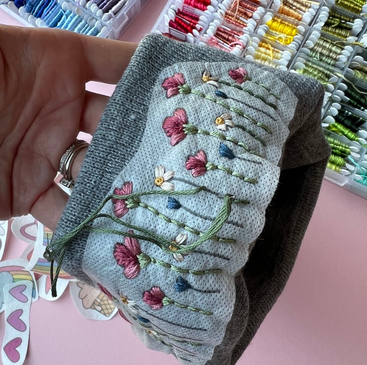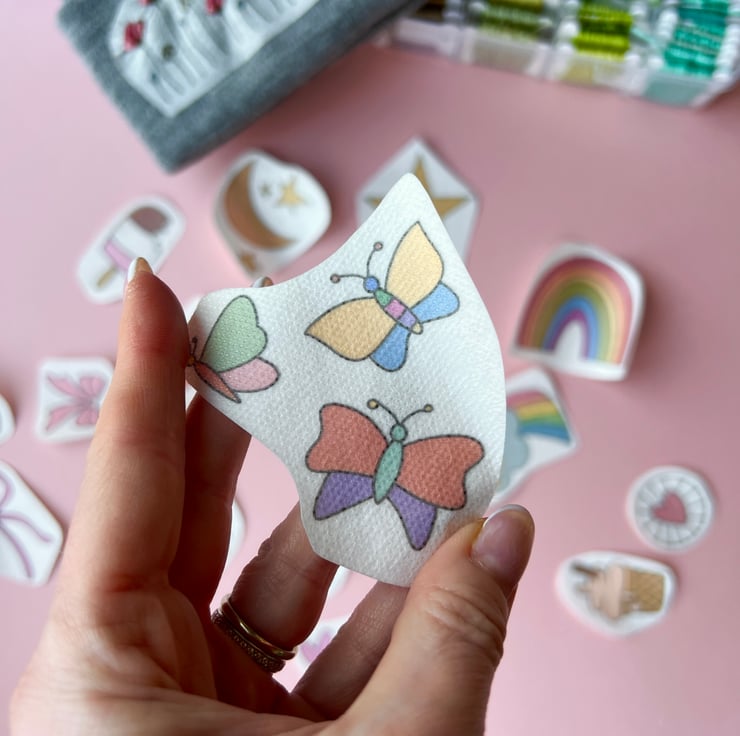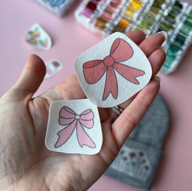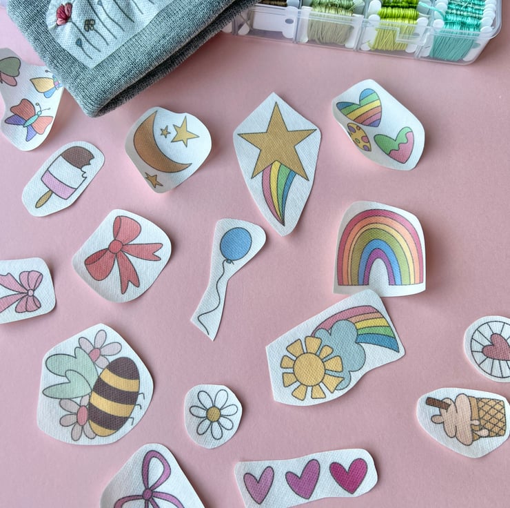 Stick and Sew Cute Embroidery designs. 17 preprinted designs on soluble stabiliser. Simply cut out your design, stick, stitch and wash away. These designs are filled with colour but can be stitched in anyway you like.