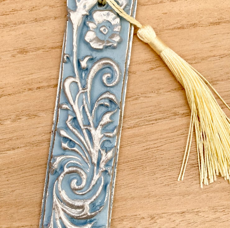 Handmade Architectural Moulding Bookmark With Cream Tassel in Pastel Blue & Silver