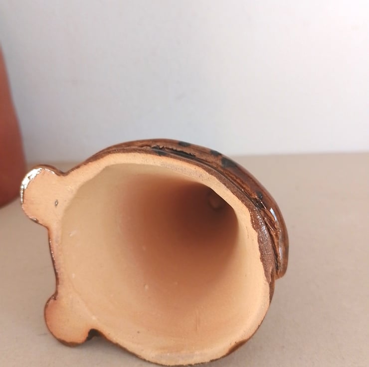 A Pottery hand made Cat ornament from Penarth Ceramics. Made with the slab method from Stoneware clay. Features are the Cats paws are in relief and it has a tail curled around the paw, and tall cat ears. Glazed in a high glossy brown and black spotted finish. Stands 12.7 cms x 8 cms wide.