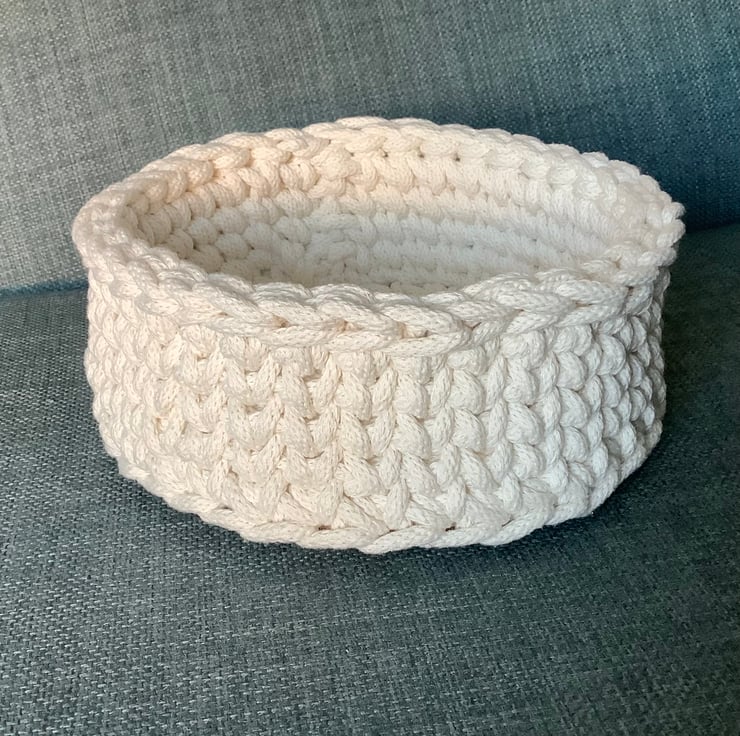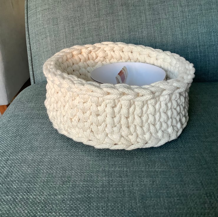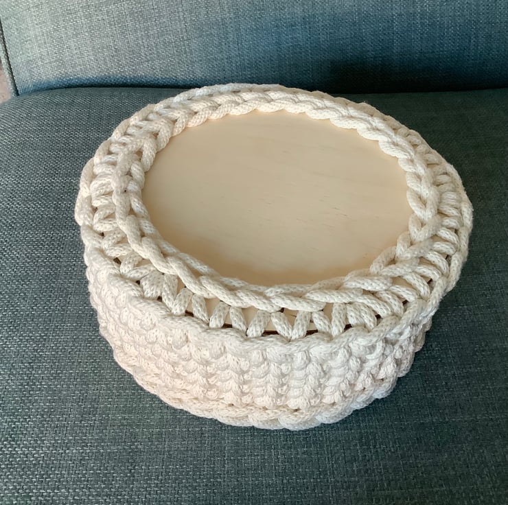 I have crocheted this useful basket using a recycled braided cotton cord onto a plywood base that has pre drilled holes in it.