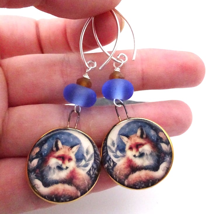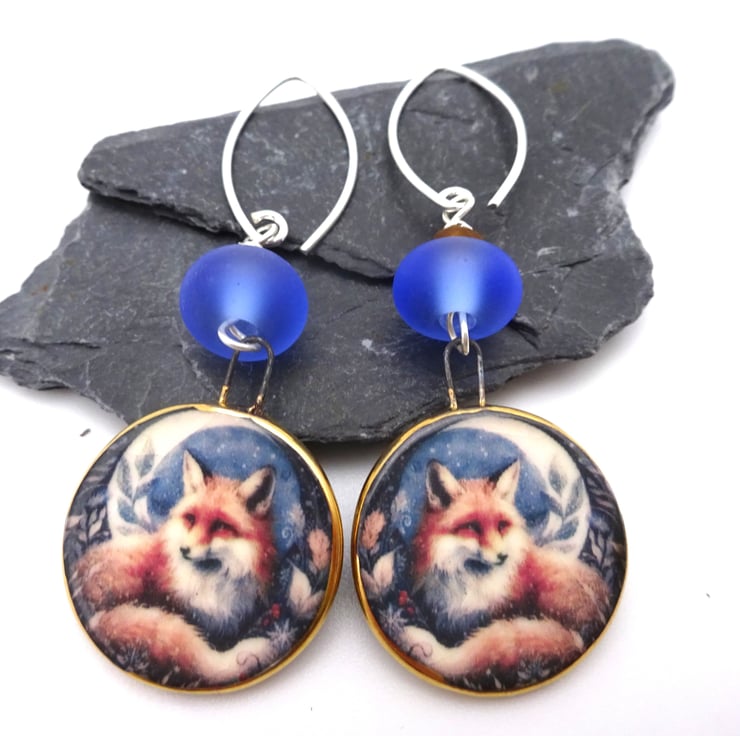 A pair of earrings made with sterling silver ear wires, handmade lampwork blue glass beads and handmade ceramic charms decorated with the image of a fox.