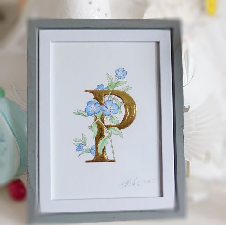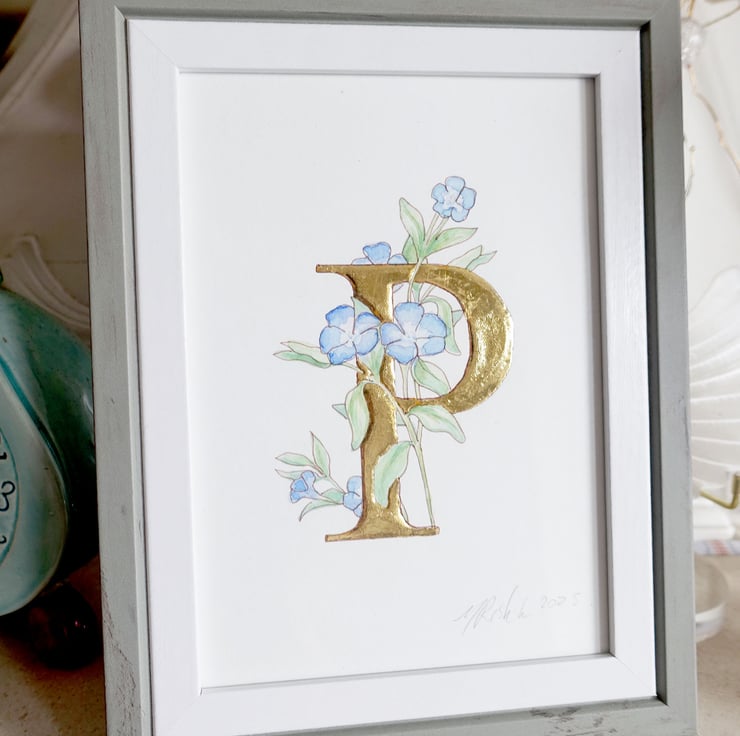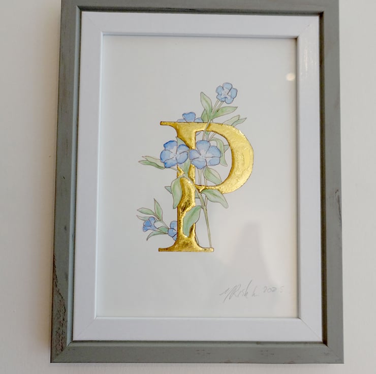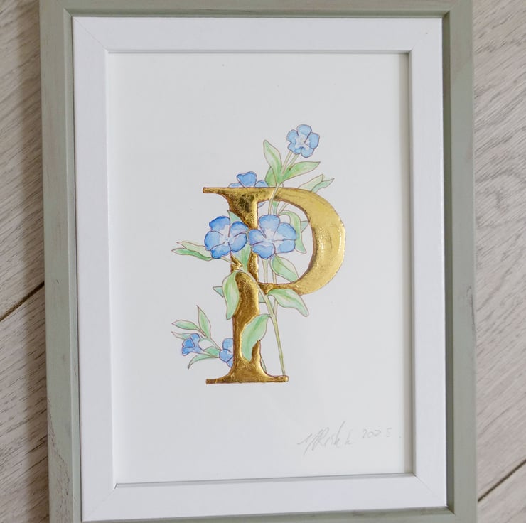 This original watercolour is a simple blue Periwinkle flower entwined around the capital letter P which is overlaid with pure 23.5 carat gold leaf.