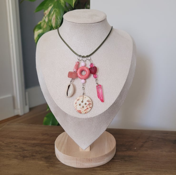 Made with buttons, broken jewellery, and stainless steel/zinc alloy jump rings/pins. Wax cord chain: 5cm extension chain, 45 cm in length. Metal - 14ct 3 colour gold. Pendant length: 3 inches.