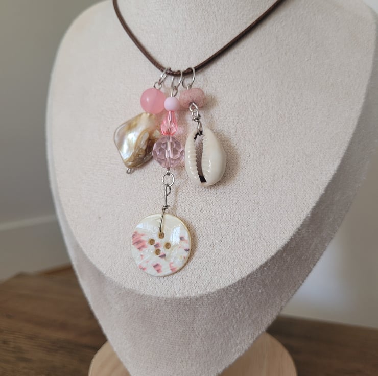 Upcycled Button and Shell Charm Necklace with Brown Cord.