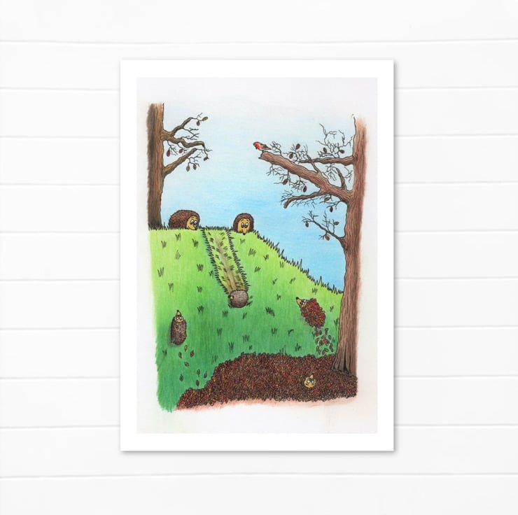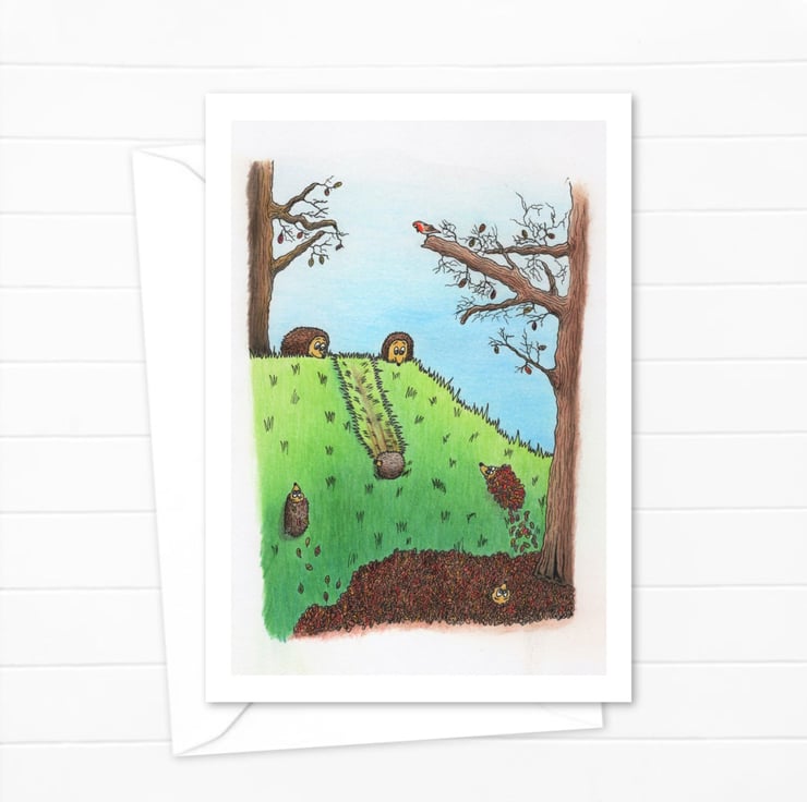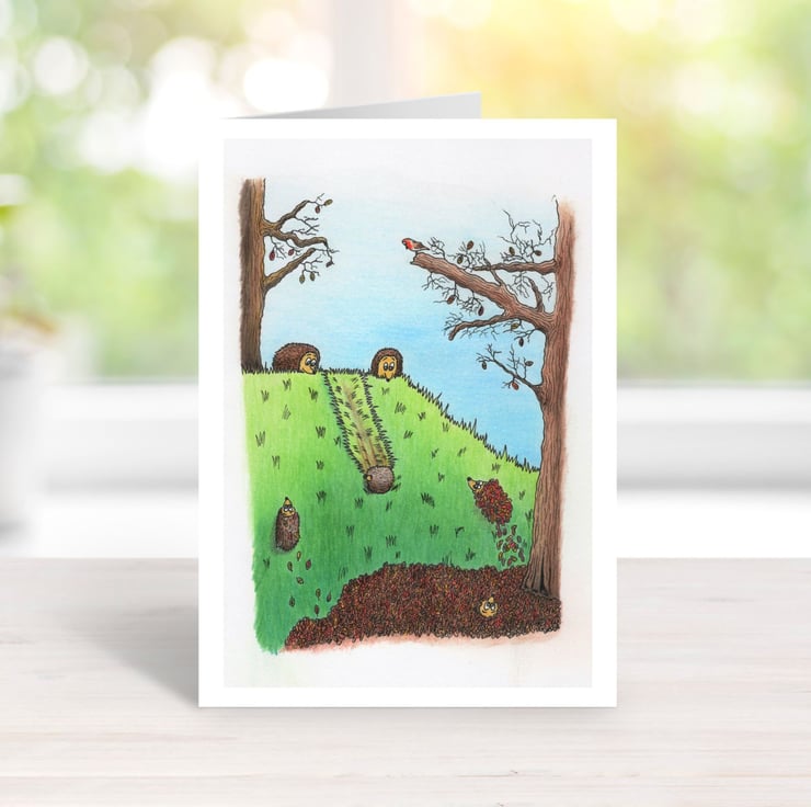 An original art greeting card featuring a hand-drawn pencil illustration of of playful hedgehogs enjoying the autumn leaves. Perfect for any occasion.