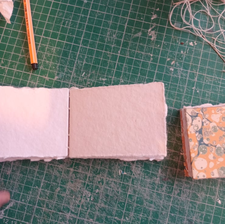 A7 watercolour mini sketchbook, with coptic stitch open spine and cotton rag paper hand- torn to size. Printed decorative paper cover
