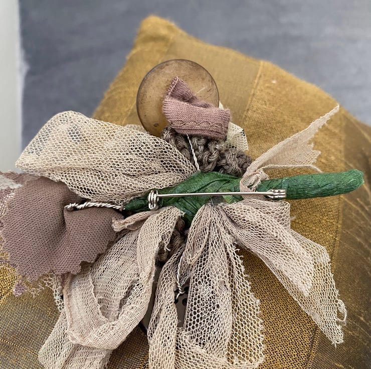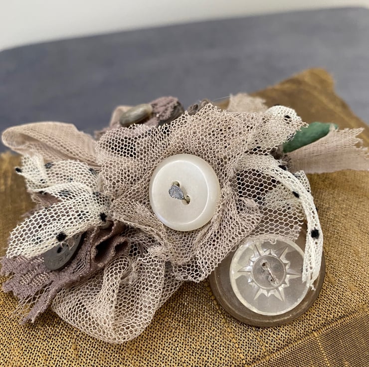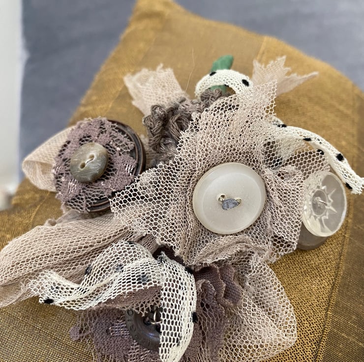 Add a touch of charm and nostalgia to your outfit with this one-of-a-kind brooch, handcrafted from a beautiful selection of vintage buttons. Arranged in a delicate floral bouquet, each button has been carefully chosen for its character, creating a timeless piece with a lovely mix of soft browns, beige, cream, warm neutrals.