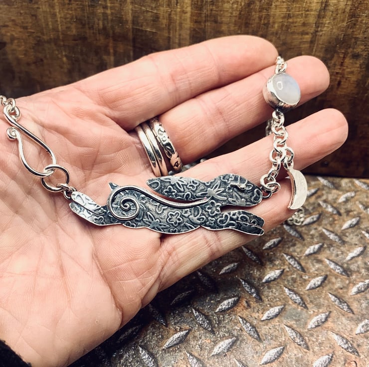 This Sterling Silver necklace features a beautifully crafted Hare, which has been pierced from a sheet of silver using traditional jewellery techniques and embossed with a unique pattern. The Hare is paired with a Silver Moon and a flashy blue Moonstone, all set in silver and linked together with a handmade heavy-weight Belcher chain. Some parts of this necklace are oxidised to enhance the detail