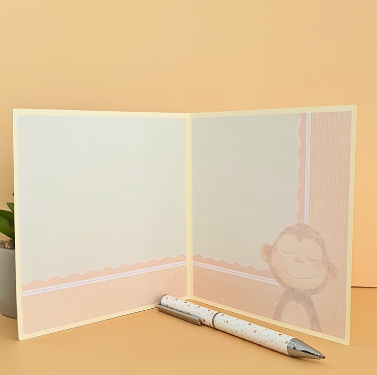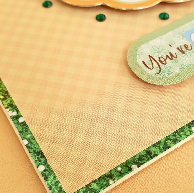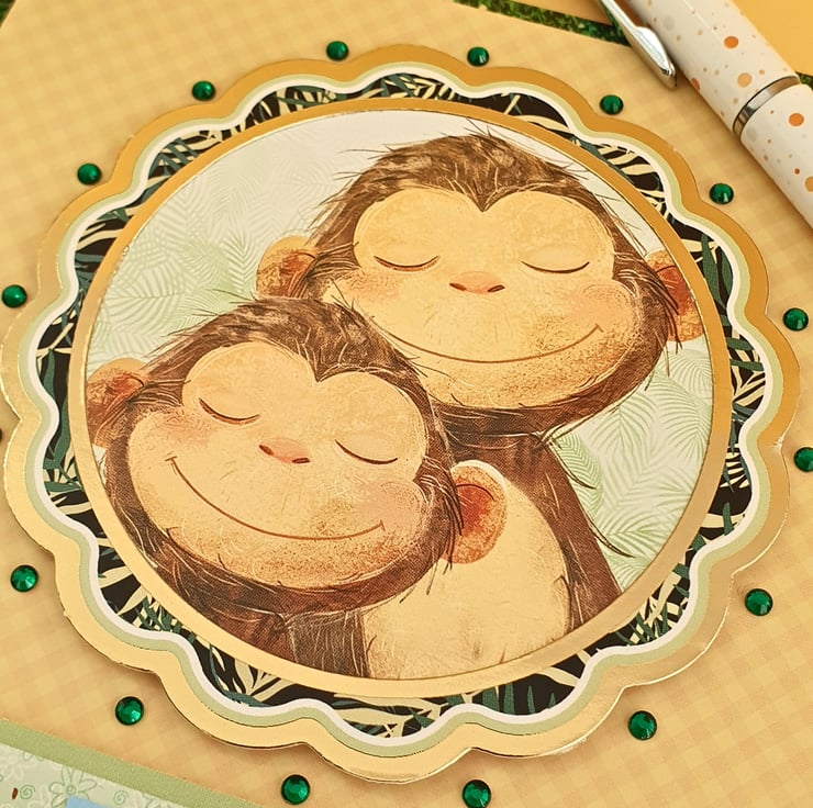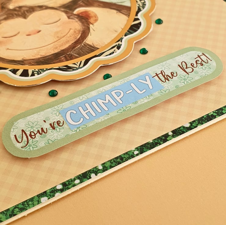 It consists of ivory card base, layered with green mirror cardstock & luxury patterned paper in peach shades. The main topper of a pair of chimps is in the middle of the card, surrounded by a scalloped frame. Between each scallop, there is a small green diamante. The sentiment "You Are Chimp-ly The Best" lays underneath the round topper. Finished with a matching insert that has been left blank for you to add your messages and wishes.