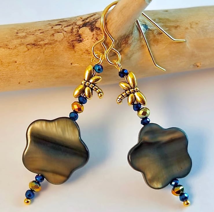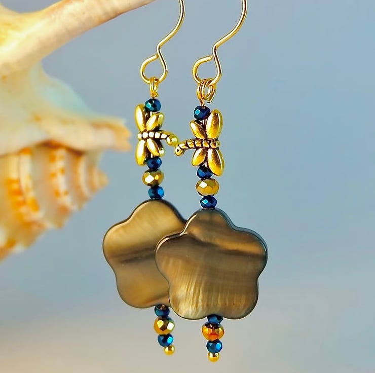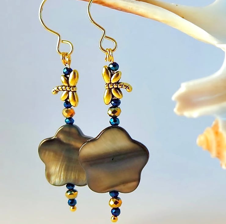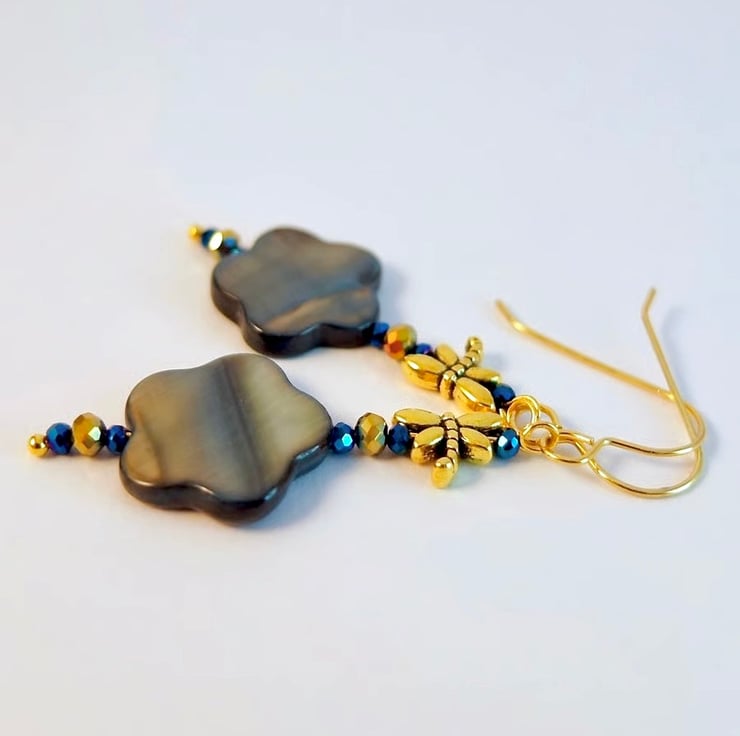 Each pretty drop earring features a 15mm graphite grey Mother-of-Pearl flower-shaped bead, topped with an 8mm Tibetan antique gold dragonfly bead.