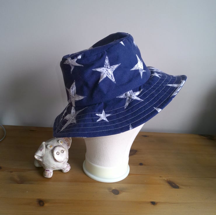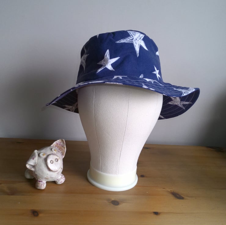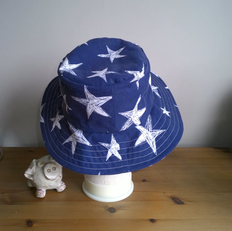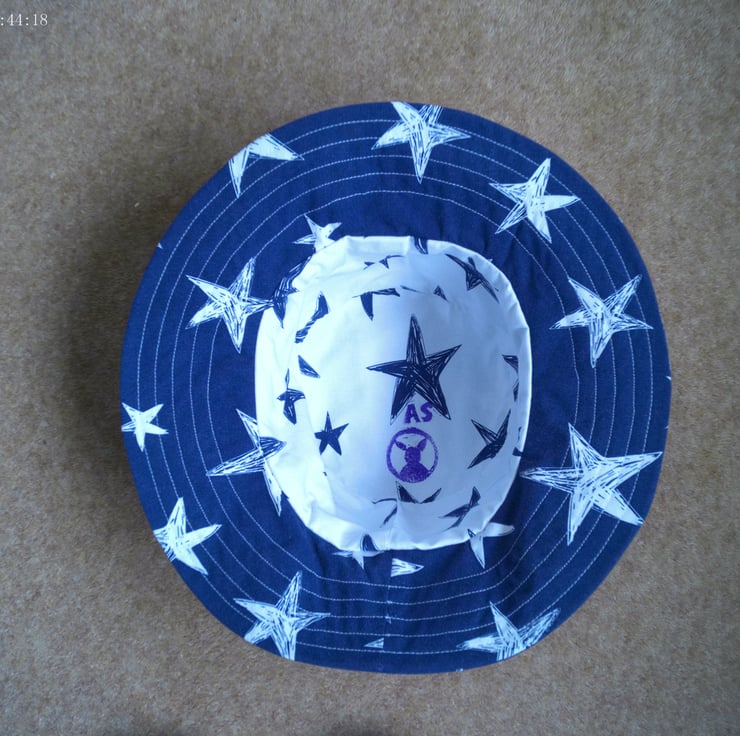 This hats is a bucket sun hat and it is made from recycled printed cotton fabric.