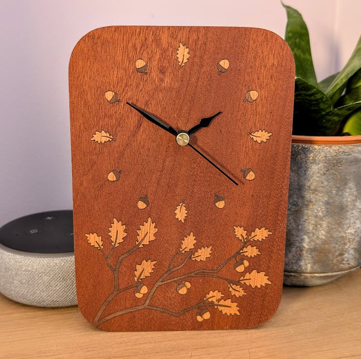 The clock is built up using plywood. I have used a laser cutter to create the perfect veneer shapes and then glued and sanded by hand. A danish oil finish has been supplied to keep the clock looking elegant and protect from spills.