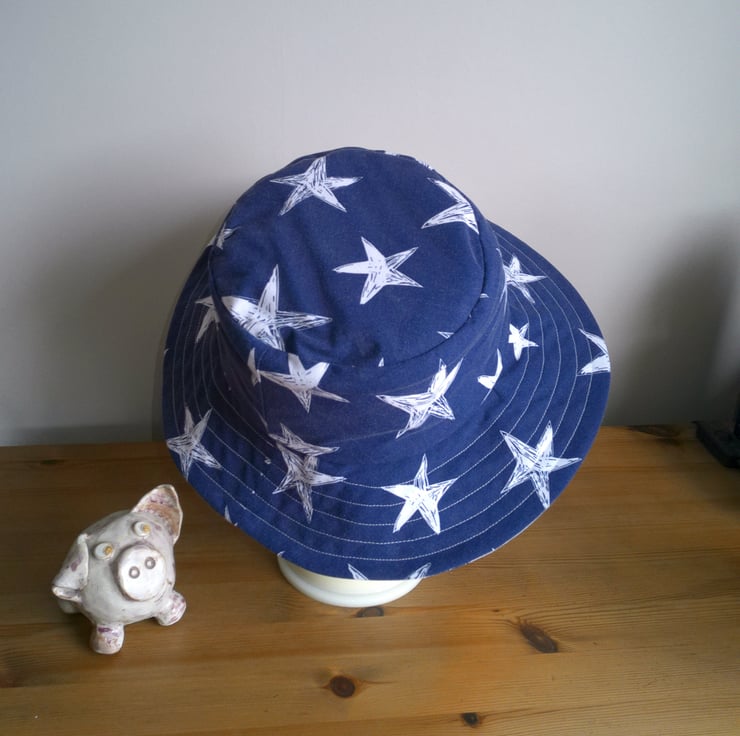 This hats is a bucket sun hat and it is made from recycled printed cotton fabric.