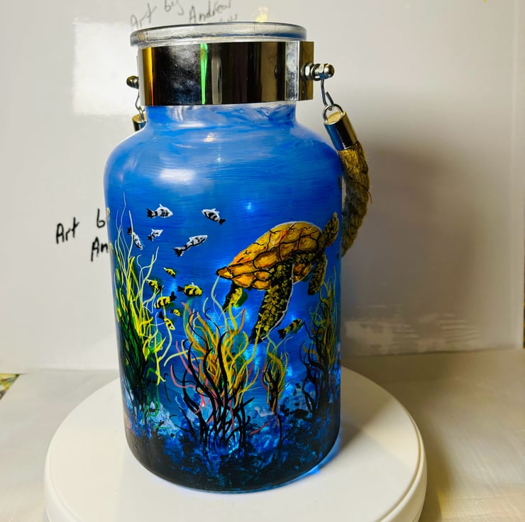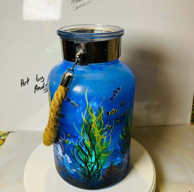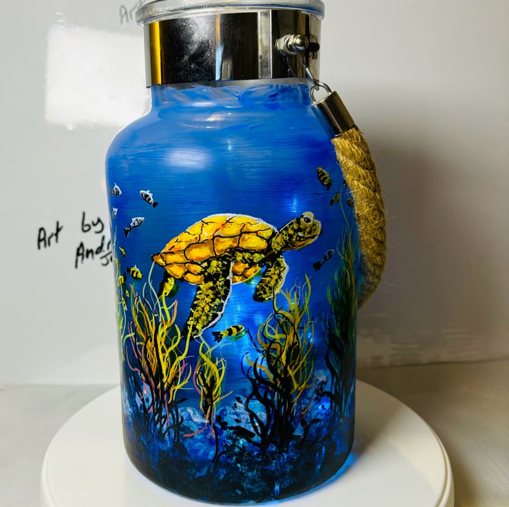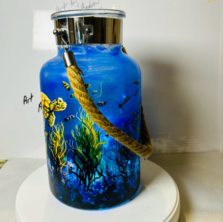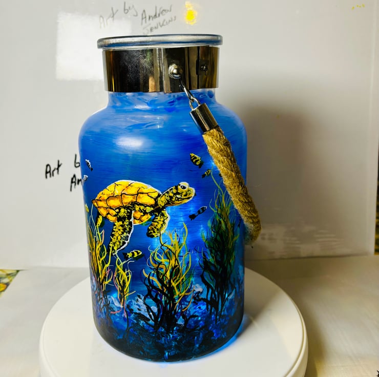A hand painted and fired metal and glass lantern by Andrew Jenkins