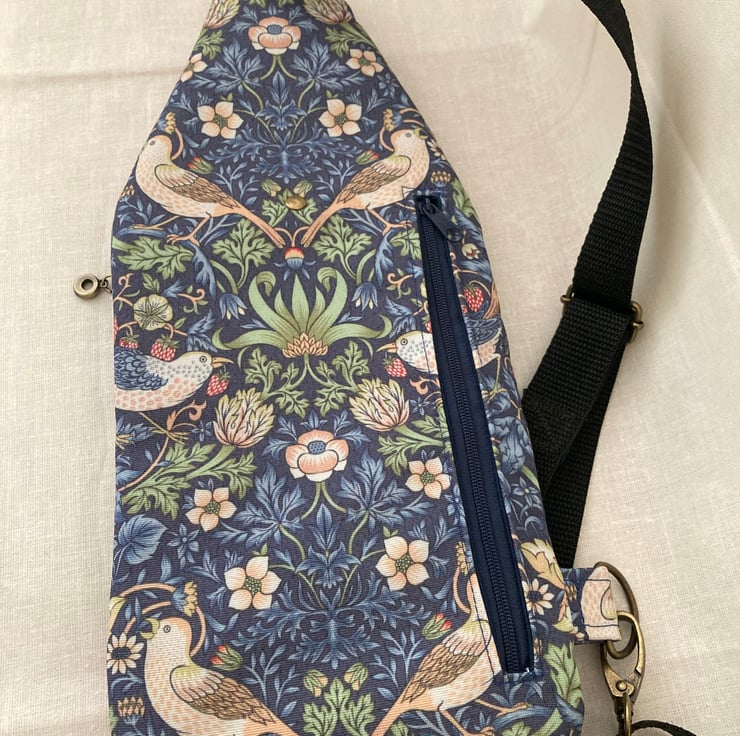 This is a crossbody sling bag. It can be worn over clothing or under a coat. It measures 30 cm long and 15cm wide and has three pockets which can fit phone, keys, cards and money. The back pocket is ideal for a passport.