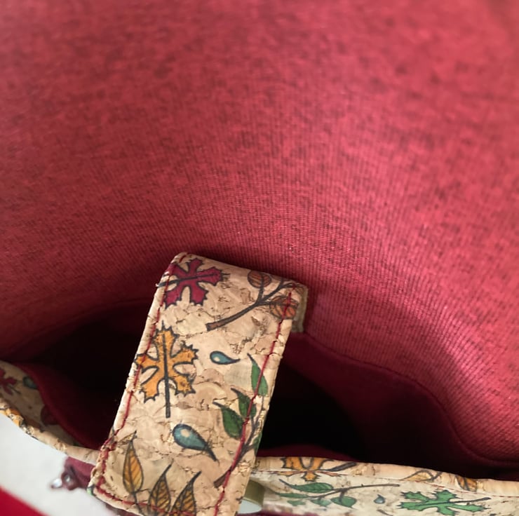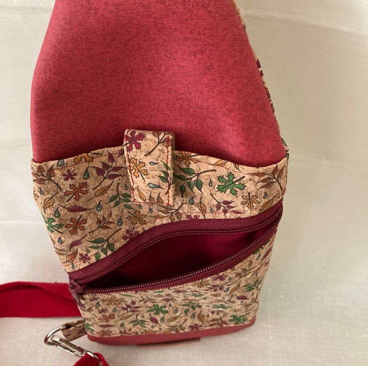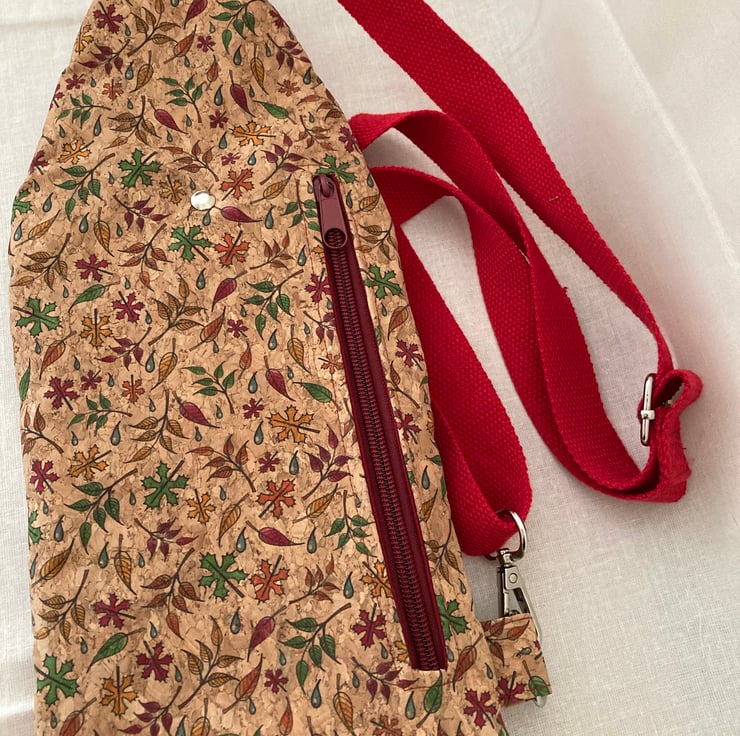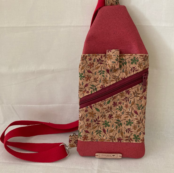 This is a crossbody sling bag. It can be worn over clothing or under a coat. It measures 30 cm long and 15cm wide and has three pockets which can fit phone, keys, cards and money. The back pocket is ideal for a passport.