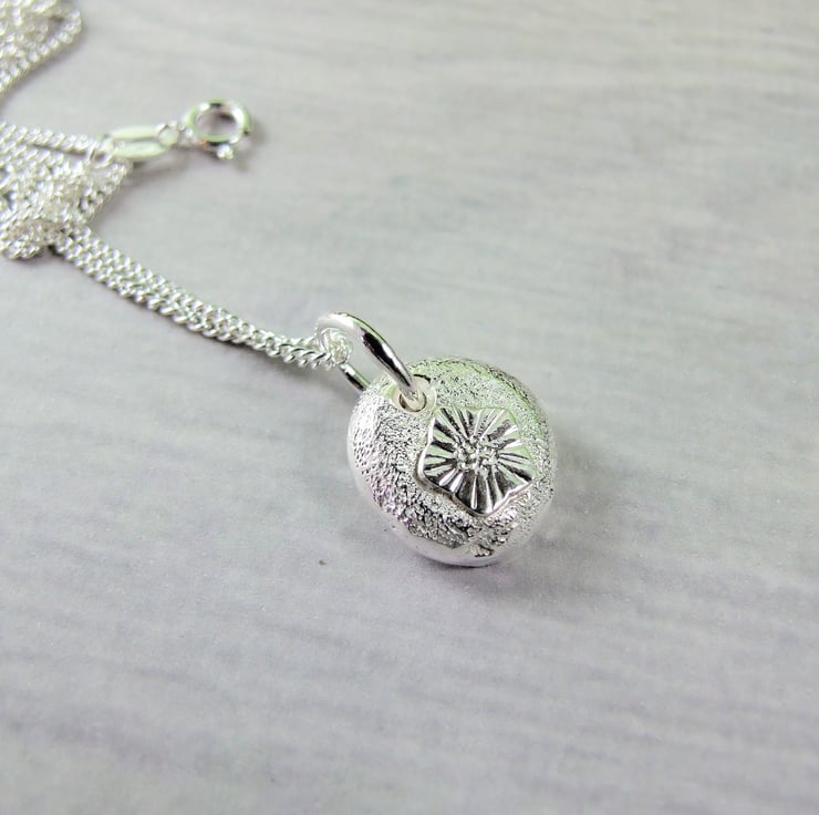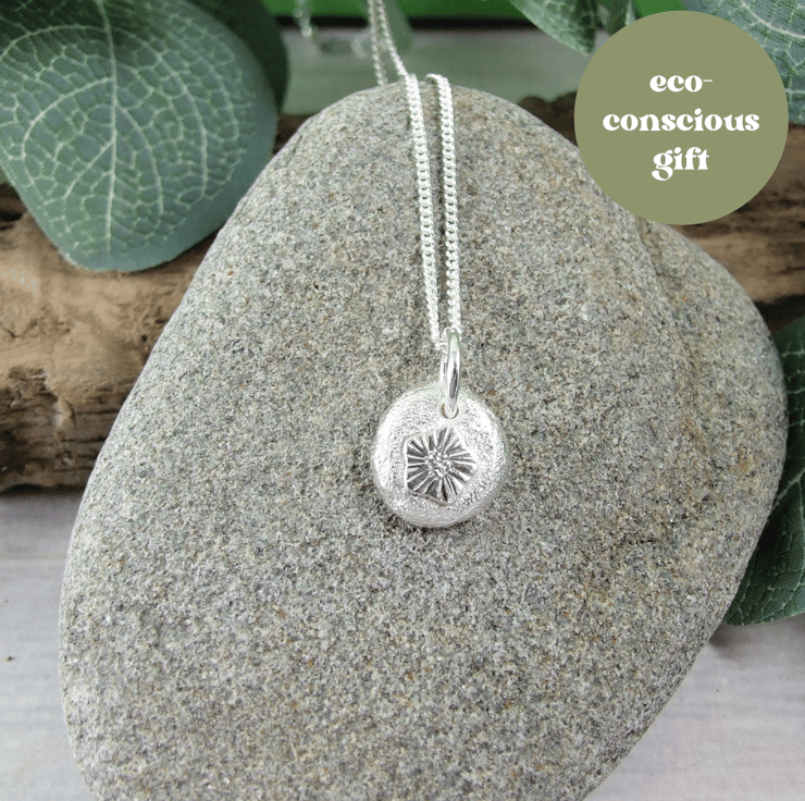 I have created the silver nugget from recycled silver heated to melting point when it forms a natural pebble shape, then once cooled slightly flattened on the top and added the loop to hang. I then soldered on a tiny star shaped flower. I created the texture on the pebble and flower hand tools to give detail. Fitted to an 18 inch sterling silver chain.