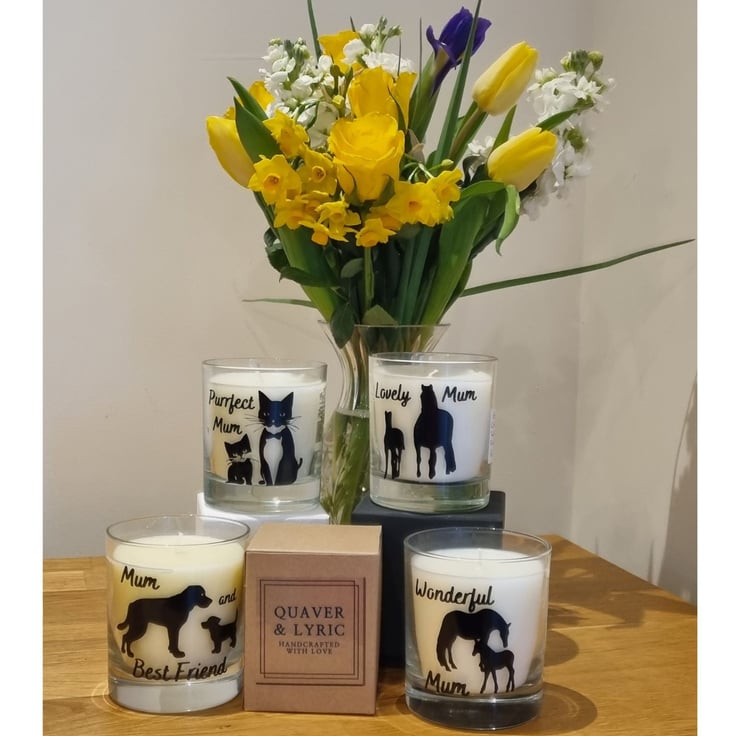 A scented candle with a black vinyl dog and puppy design and caption Mum and My Best Friend. Lovely gift for mother's day or for a Mum's birthday. Handmade using high quality rapeseed and mineral wax blend, the finest range of premium fragrances, poured into quality glass containers and supplied in a kraft box. The design on the scented candle is made from permanent waterproof vinyl which can be cleaned (hand wash only) allowing the glass to be re-purposed as part of your home decor after the candle has burned.