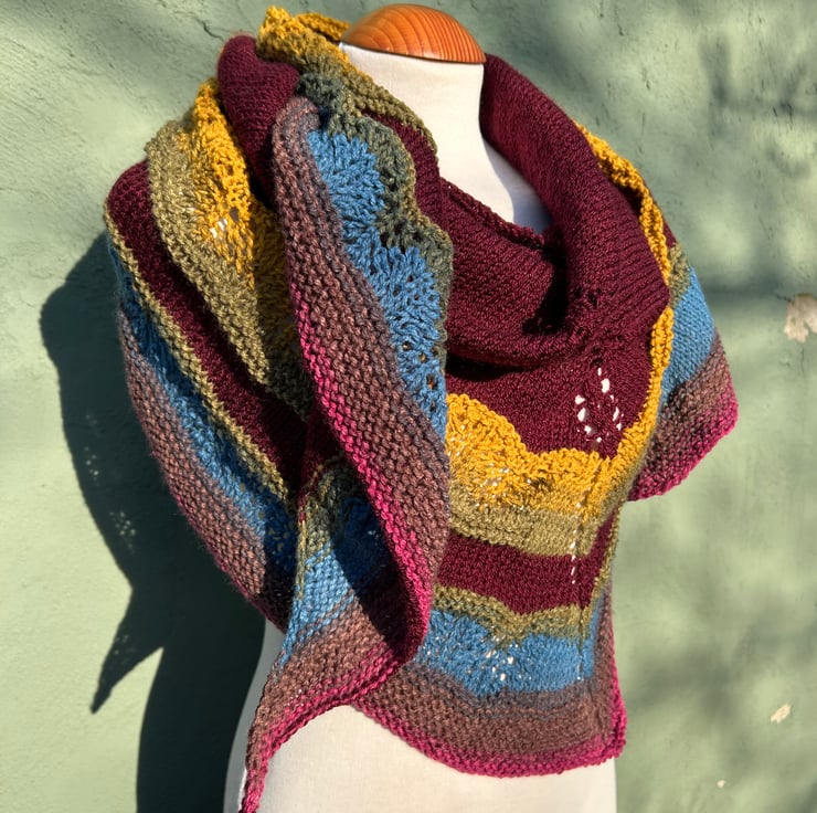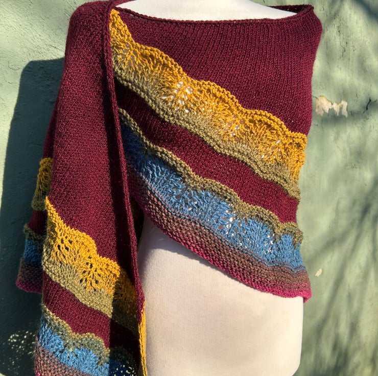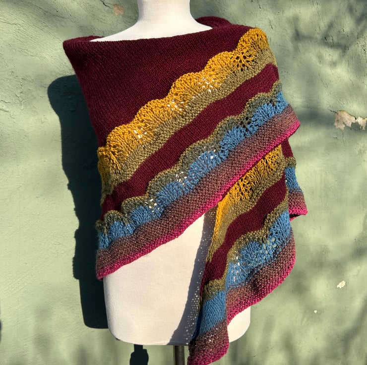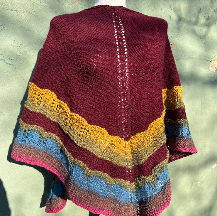 Designed and hand knitted by me on 4.5mm needles with 100% acrylic vegan friendly yarn. There are 2 yarns in this wrap, one plain maroon colour and the other is a yarn cake in ochre, green, blue and pink.