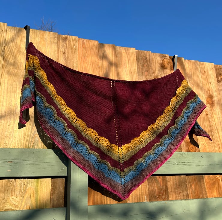 Shallow triangle in shape. It is 70 centimetres deep by 190 wingspan. So if you like your shawls to be short in the back, this is the shawl for you.
