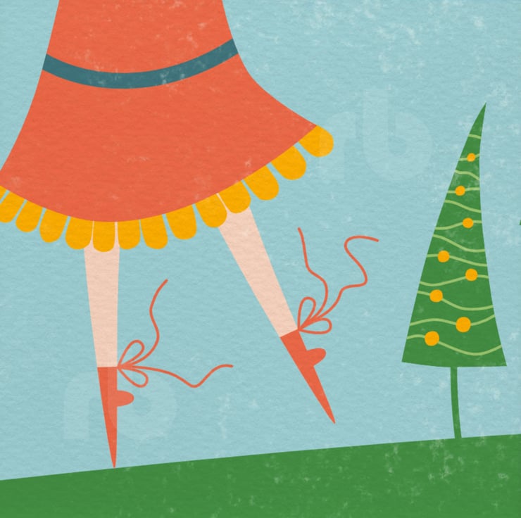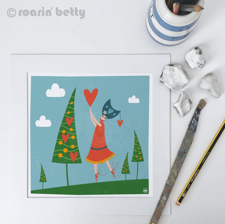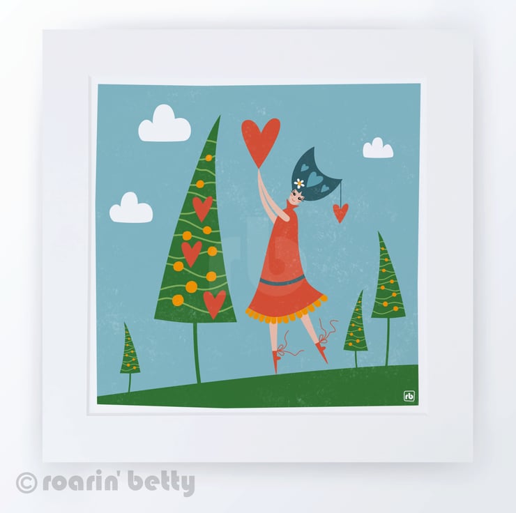 Whimsical illustration of a woman or girl in a red dress decorating the trees with love hearts... decorating the trees with love... well why wouldn't you!