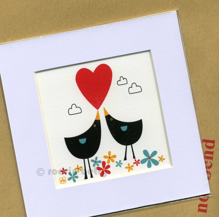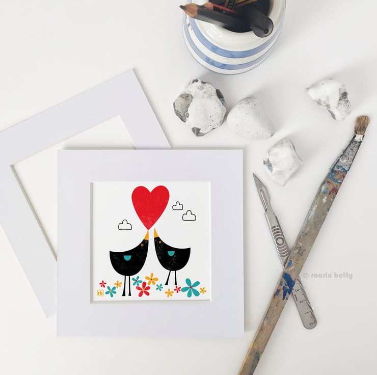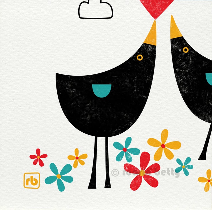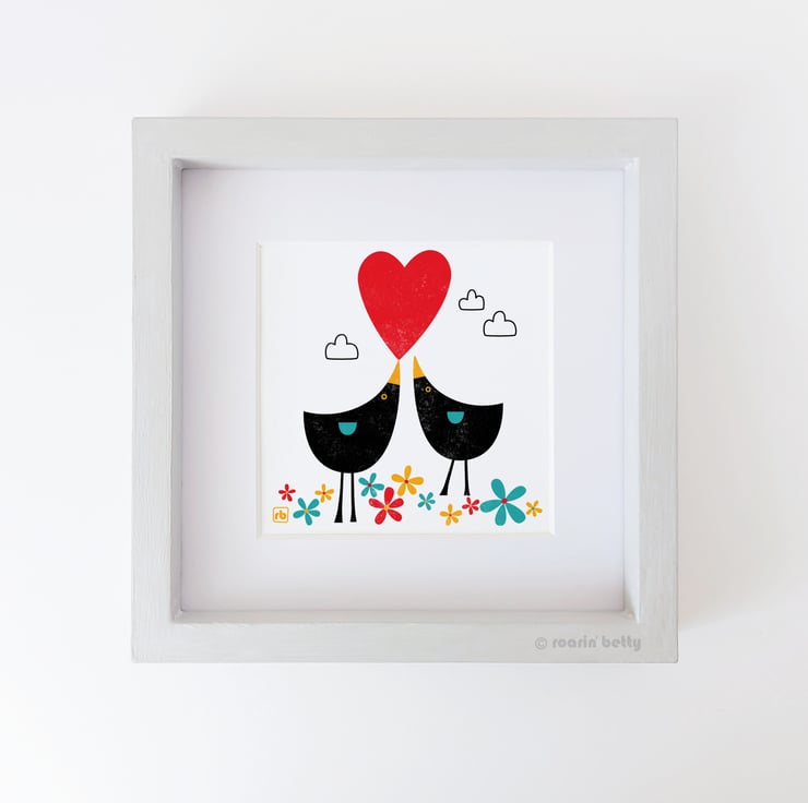 Graphic, mid century inspired print of two blackbirds with a love heart, surrounded by colourful flowers.