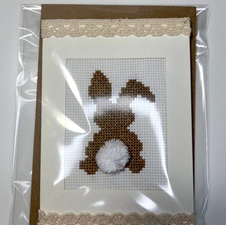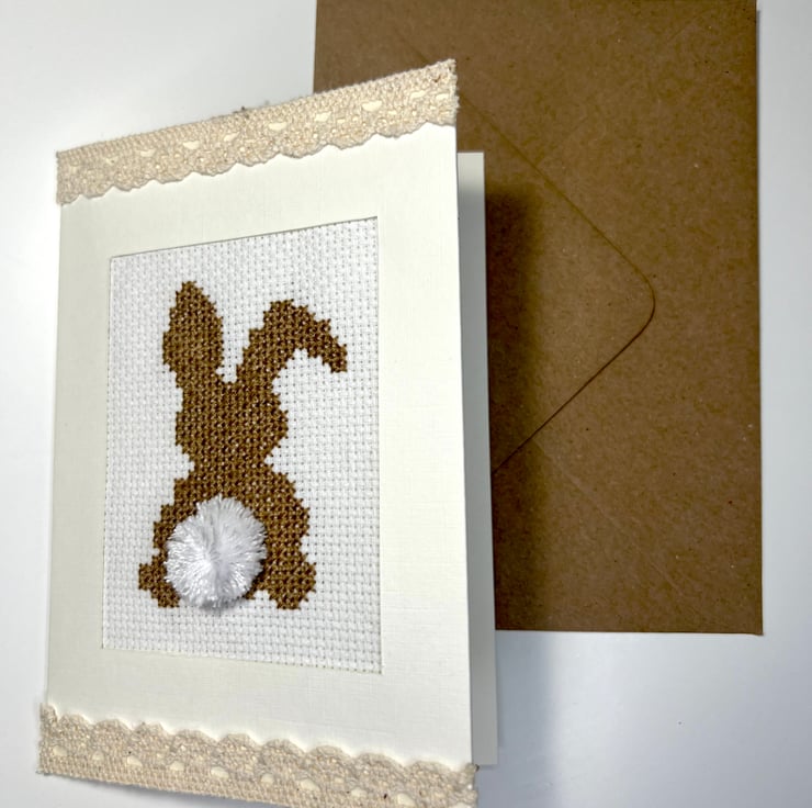 Handmade cross stitched brown bunny with handmade white pompon decorated with cream lace tape. Card with linen finish/ texture.