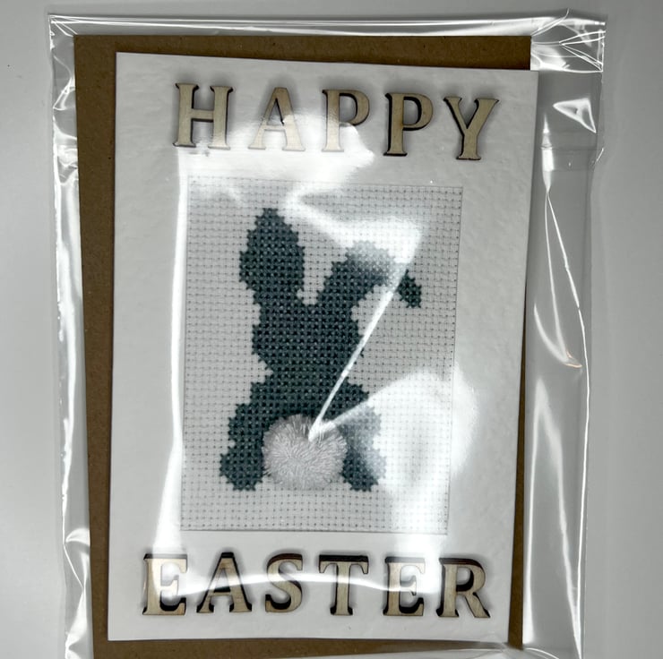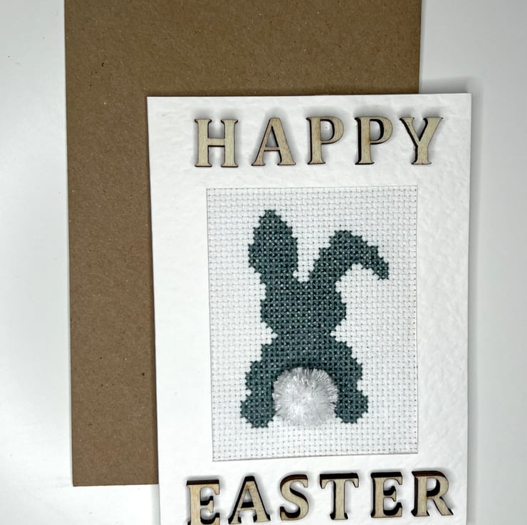 Handmade cross stitch blue/grey bunny with handmade pompon. Decorated with wooden letters Happy Easter. Card white with hammered finish/texture.