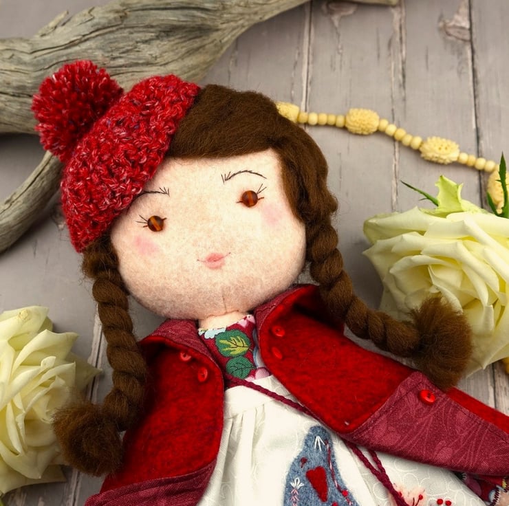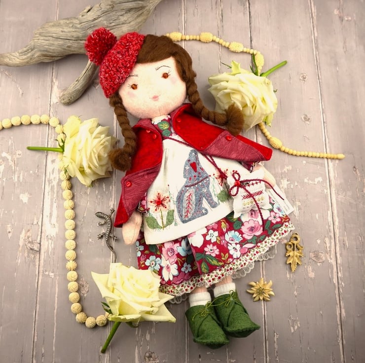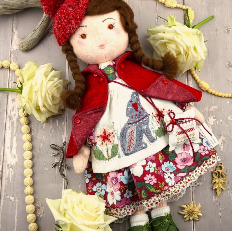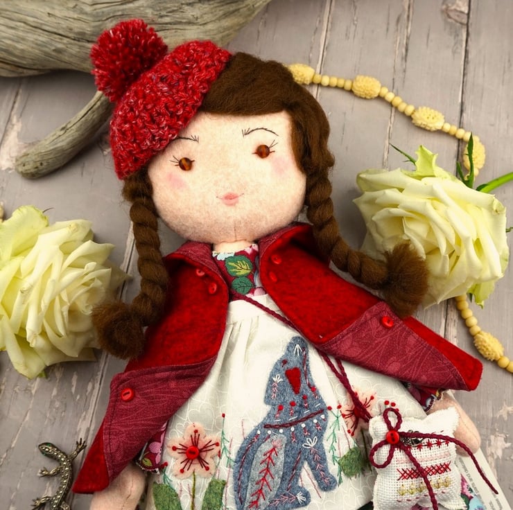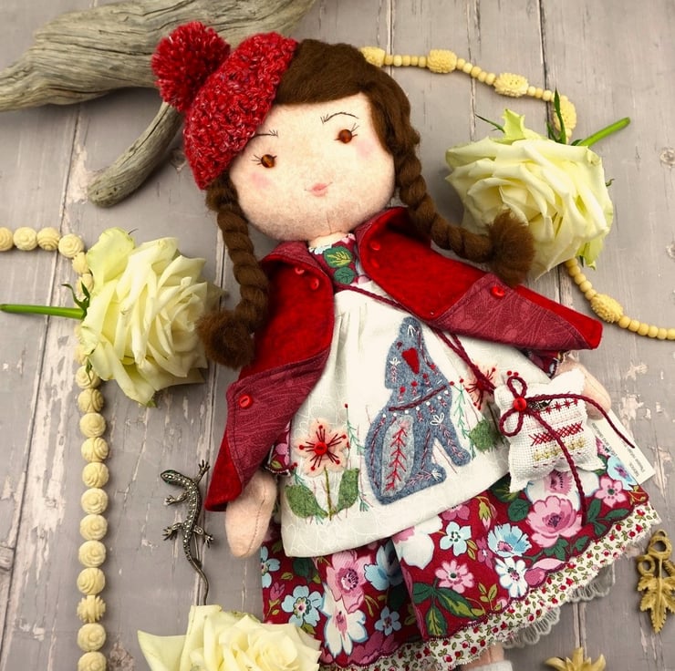 This is a little Red Riding Hood doll made from wool felt with glass bead eyes and coffee wool roving for hair. Her facial details are hand embroidered and her hair is hand styled. She is dressed in a Liberty print cotton called Hedgerow Blooms from the Heirloom 4 collection and sports a wool felt red cloak lined with Liberty fabric from the same collection. Her bobble hat is Tweed Felt Rowan Wool.