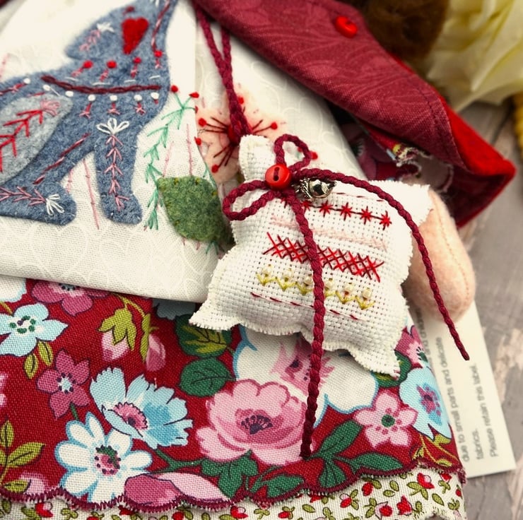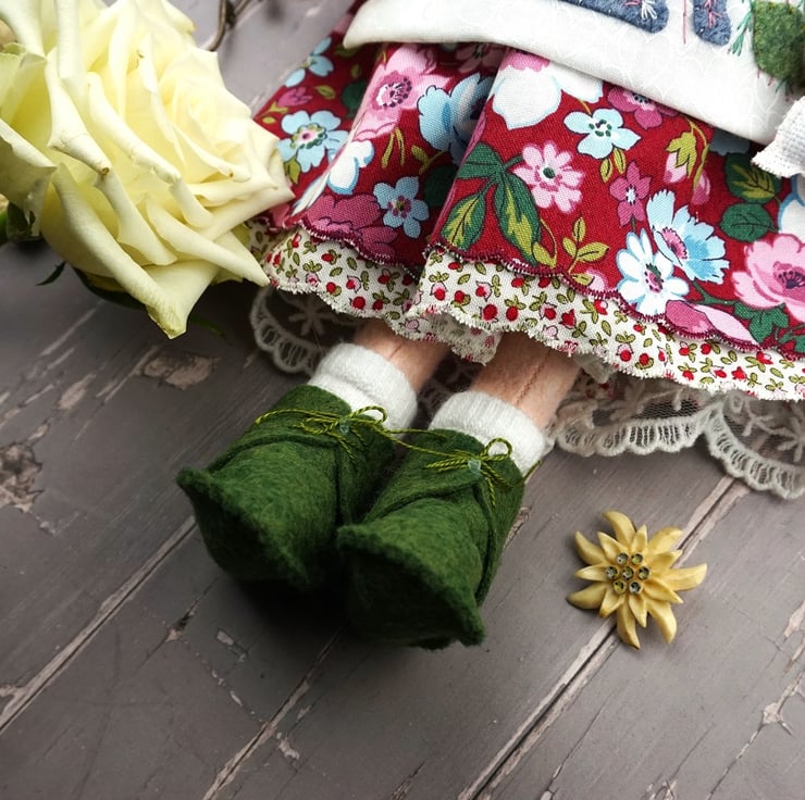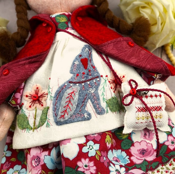 Beneath her dress she has broderie anglais drawers with tiny cotton sock and wool felt boots. Her petticoats are a Liberty cotton with white tulle lace. Her apron is heavily hand embroidered with a folk art pattern wolf accompanying her on her walk in the woods to Grandma's. She is finished with tiny buttons and a sampler pillow