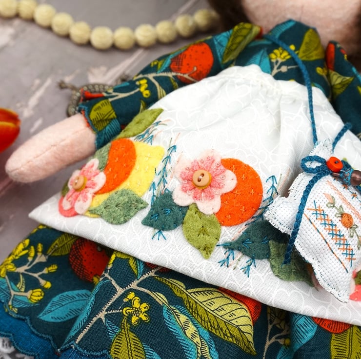 Beneath her dress she has broderie anglais drawers with tiny cotton socks and wool felt boots. Her petticoats are a peacock shot cotton with white tulle lace. Her apron is heavily hand embroidered with a folk art pattern of oranges, lemons blossom and leaves. She is finished with tiny buttons and a sampler pillow