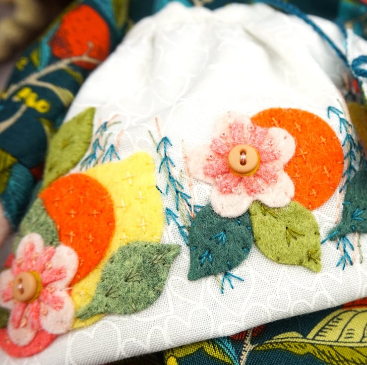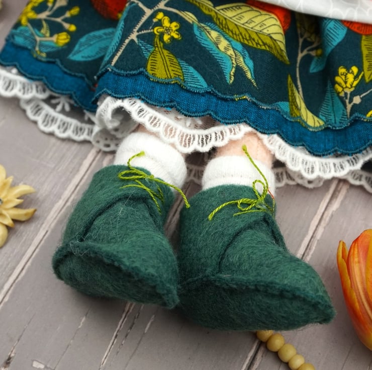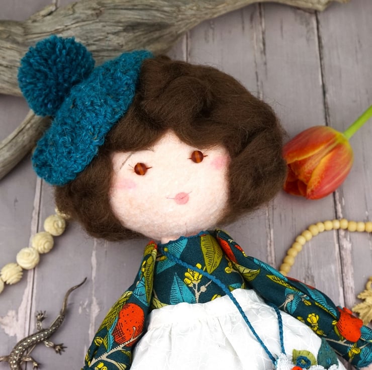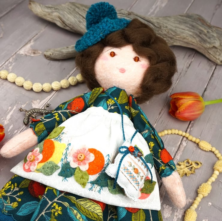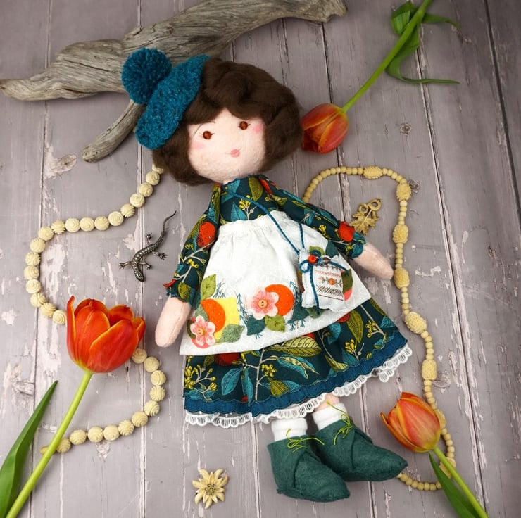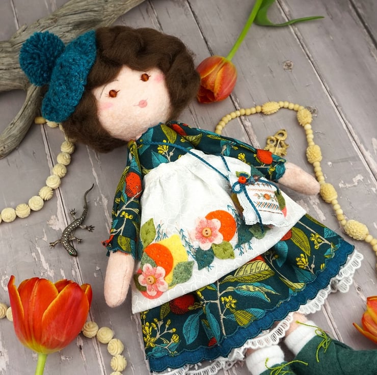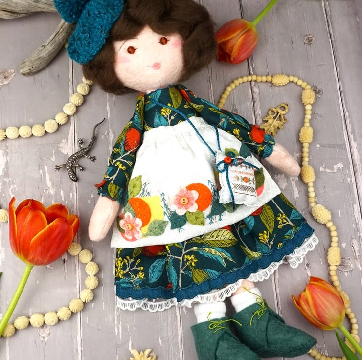 This little doll is Clementine, inspired by the rhyme Oranges and Lemons say the Bells of St Clements. She is made from quality wool felt with frosted glass bead eyes and brunette wool roving for hair. Her facial details are hand embroidered and her hair is hand styled. She is dressed in a Liberty print cotton called The Summer House from the Orchard Garden Collection, abounding with oranges and orange blossom. Her bobble hat is Tweed Felt Rowan Wool.