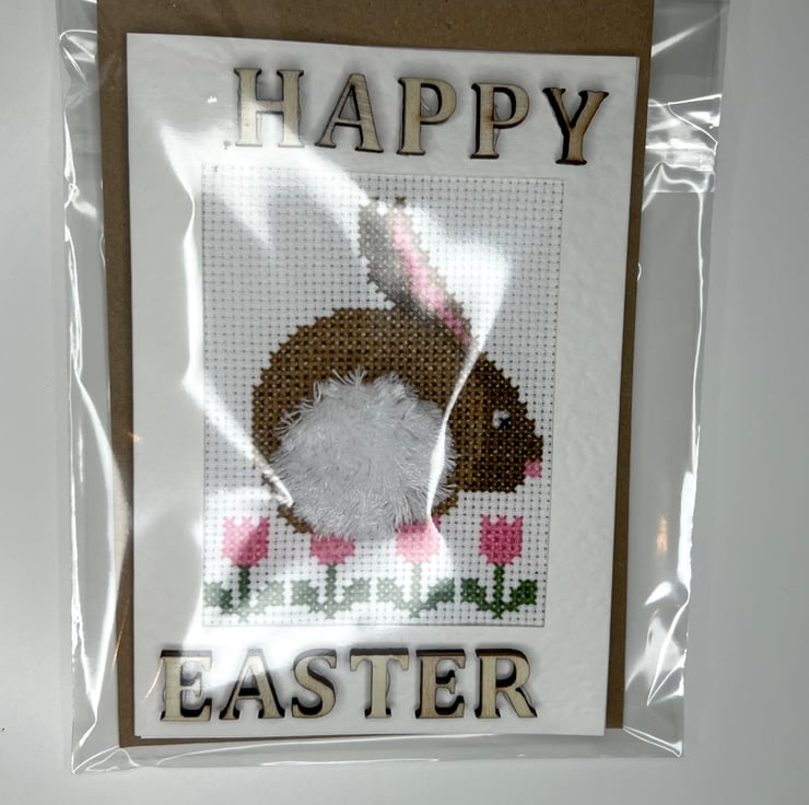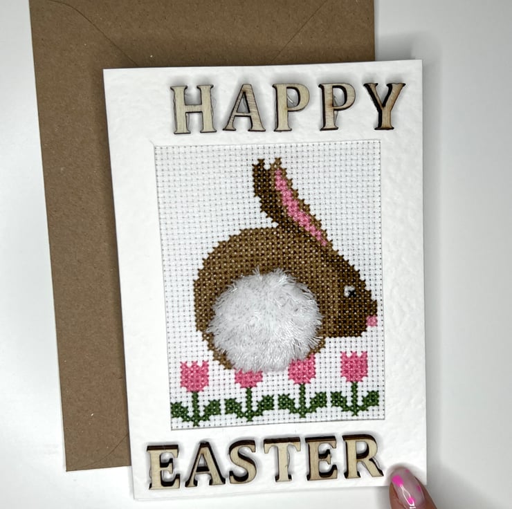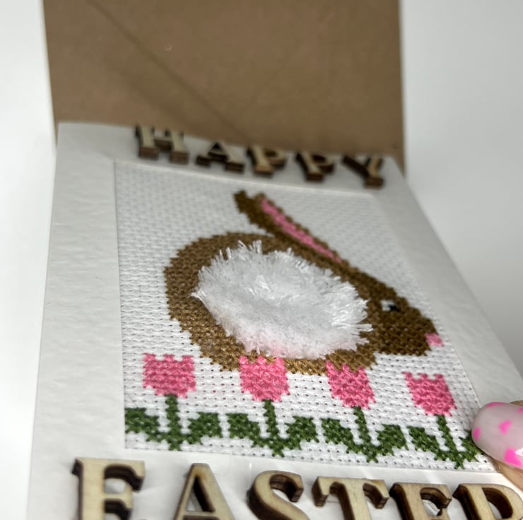 Handmade cross stitch bunny with fluffy belly. Decorated with wooden lettering. Card in white colour with hammered finish/ texture.