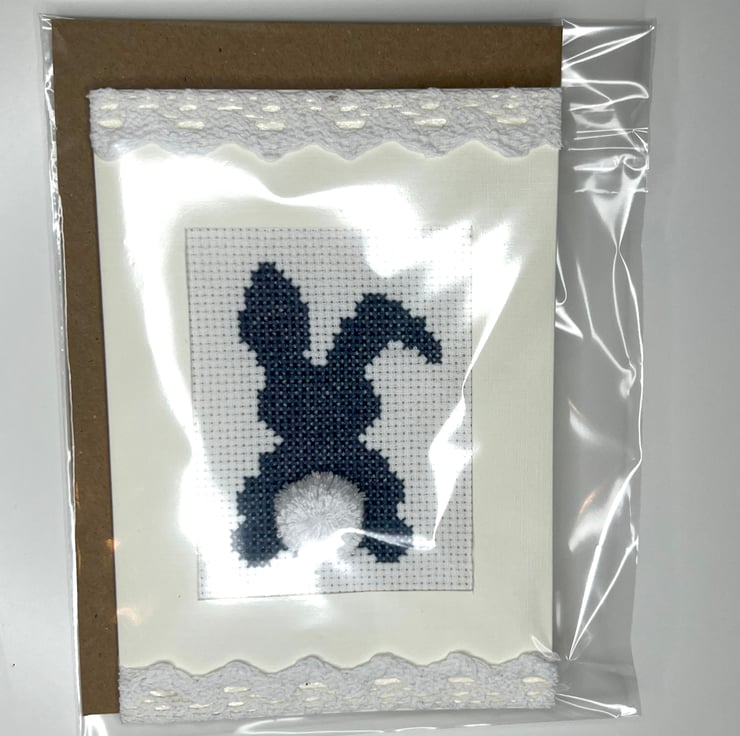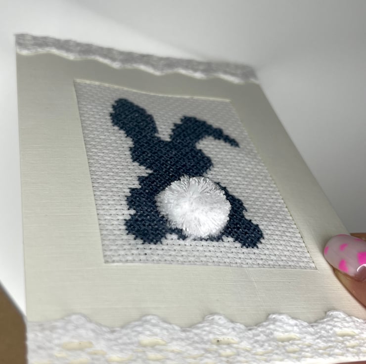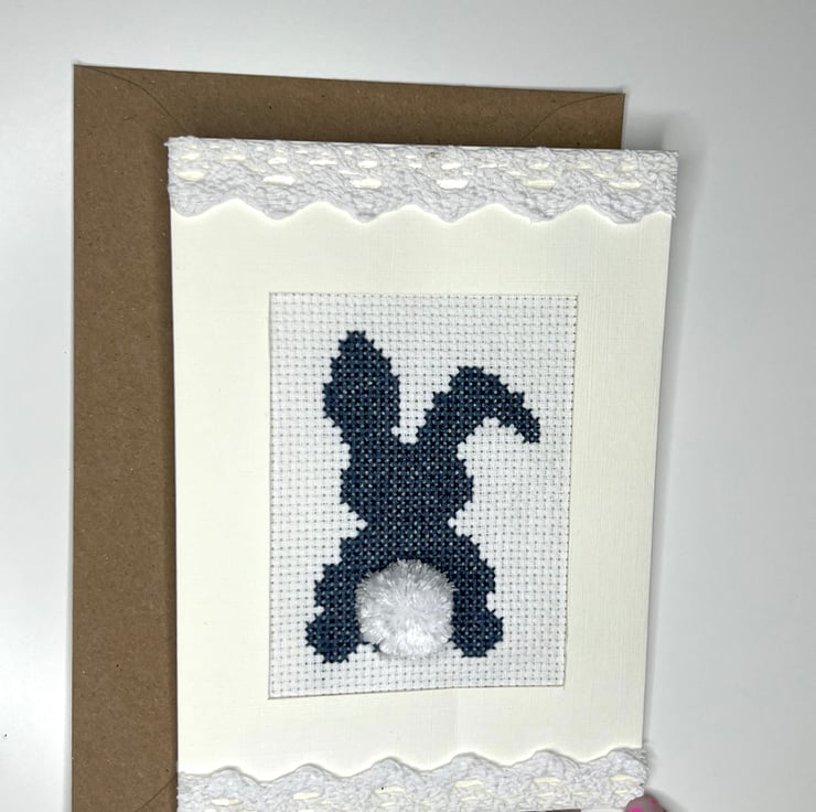 Handmade cross stitch blue (aegean) bunny with handmade pompon. Decorated with lace tape in cream card with linen finish/ texture.