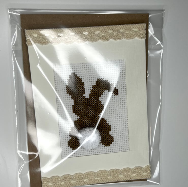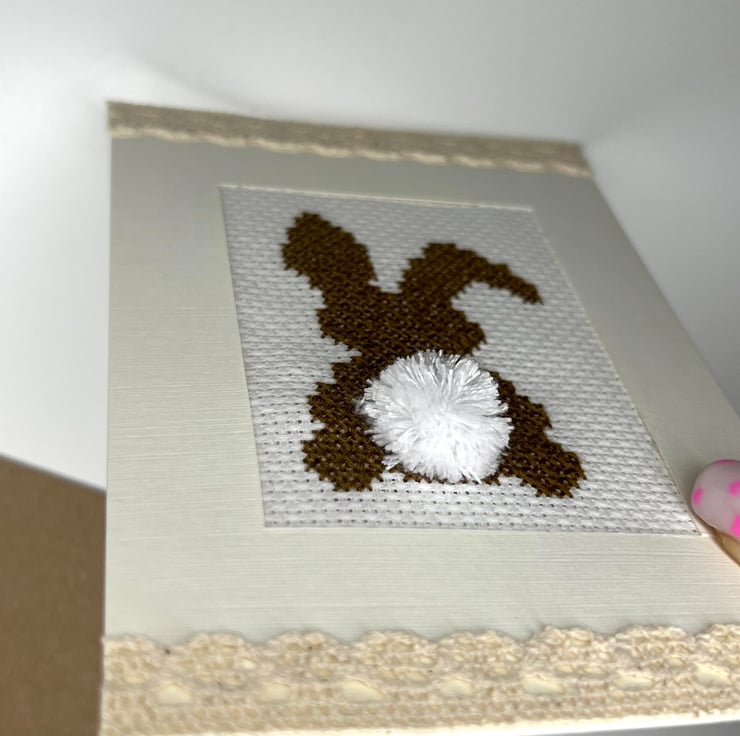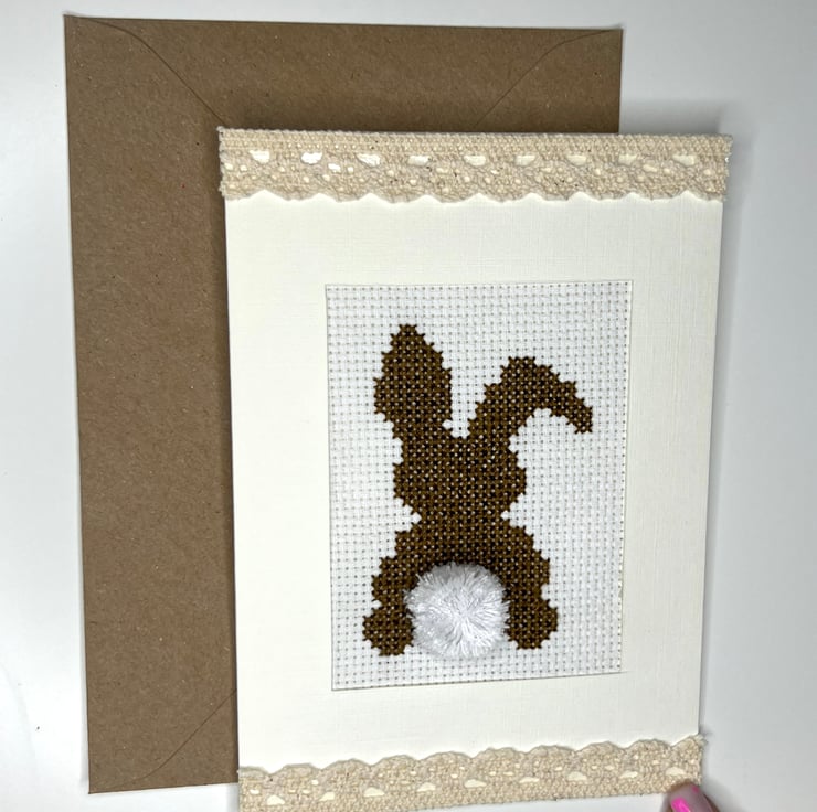 Handmade brown bunny with handmade pompon. Decorated with beige lace tape in cream card with lined finish/ texture.