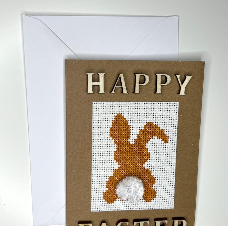 Handmade cross stitched orange bunny with handmade pompon. Decorated with wooden lettering.