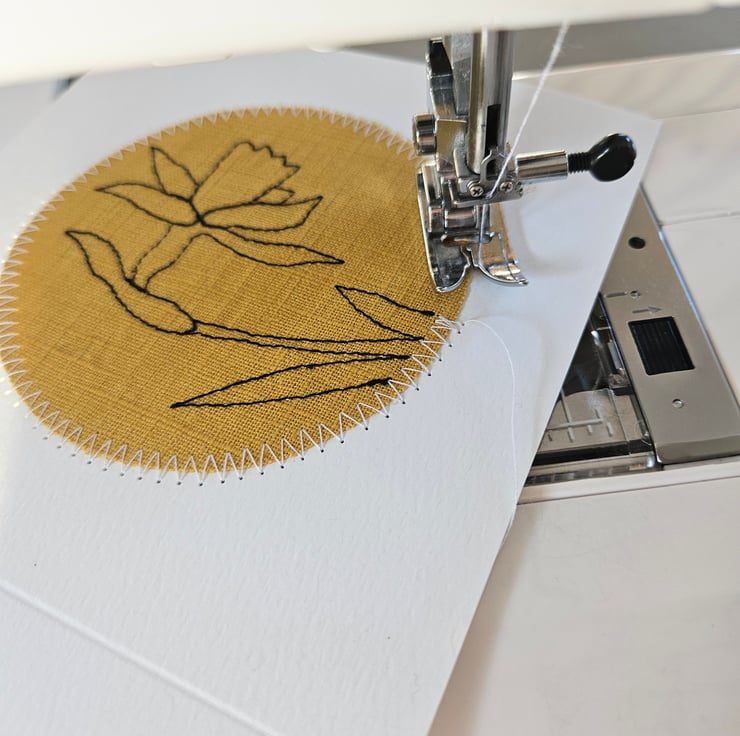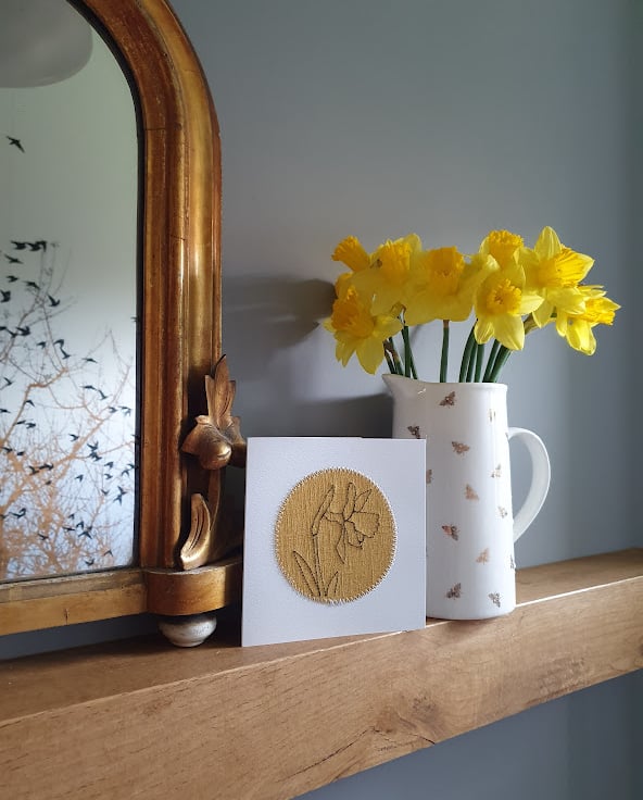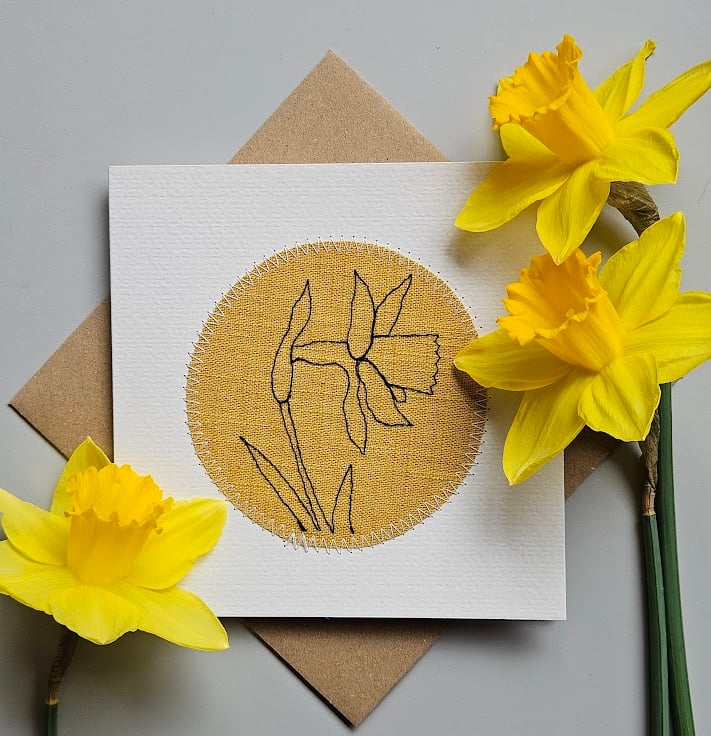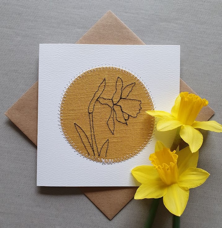 Handmade Machine embroidered Spring card featuring a Daffodil embroidered onto a mustard linen fabric. Perfect for Mother's day, Spring birthday, Easter card.