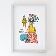 A frame is not included, however I've mounted the illustration in a white, acid free, bevel edge mount and it's ready to be popped into your favourite 6x6inch (15.3cm) size frame.