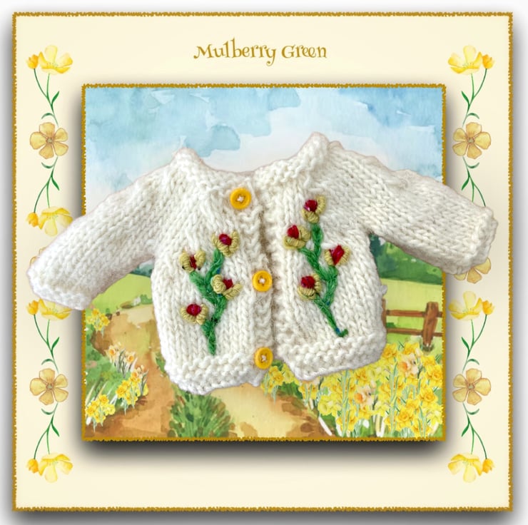 A lovely little hand embroidered cardigan, to fit the Mulberry Green dolls. The cardigan is hand knitted with pure Icelandic wool and is finished off with three little buttons.