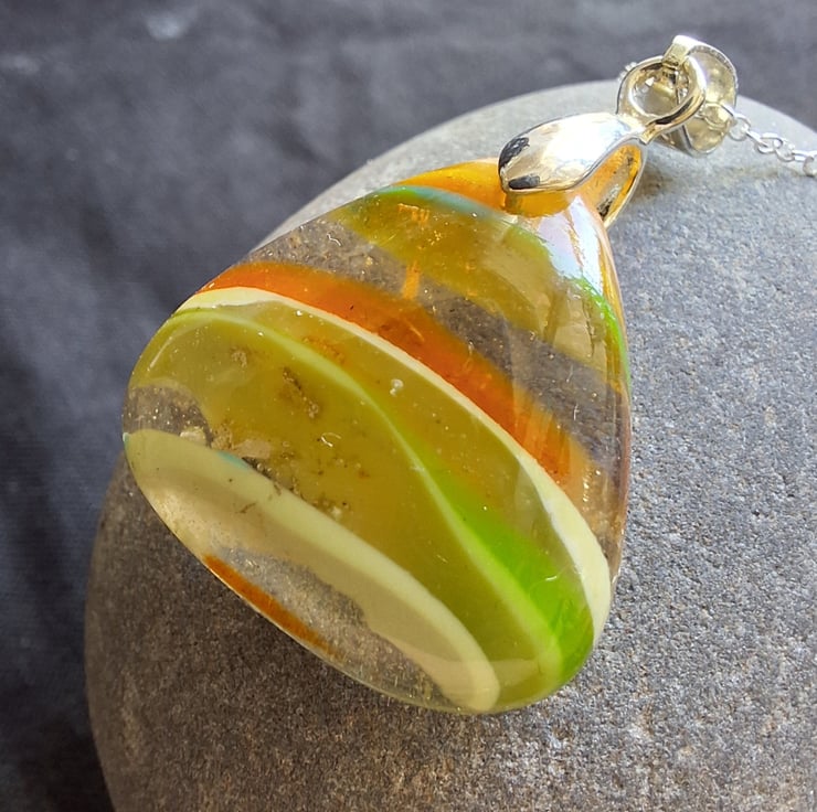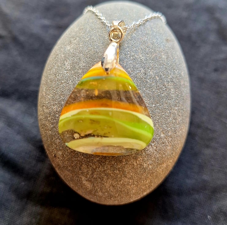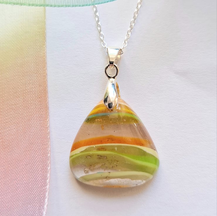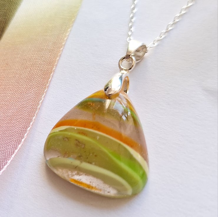 Beautiful triangle shaped piece of surfite - silver bails and silver chain. The surfite is a gorgeous green, clear, orange and yellow stripes.