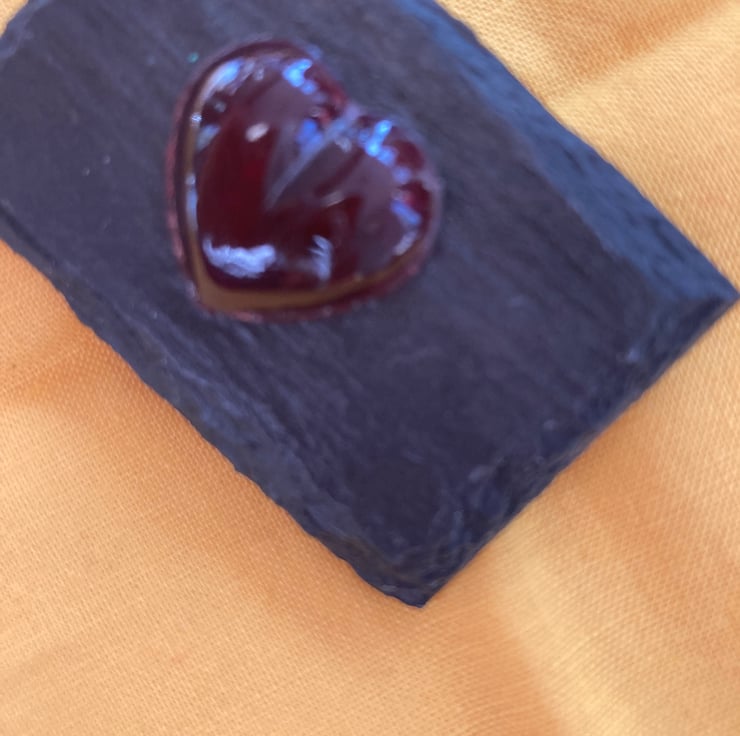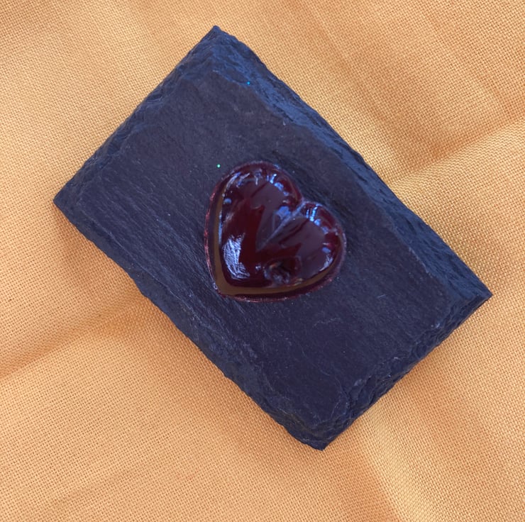 Mounted on reclaimed roof slate, this is a cute little brooch. Measures approx 5cm x 3cm (size varies depending on how the slate cuts). Deep red glass heart on slate. Looks great on a coat or jacket, or even on a hat and is appropriate for both the male and female of the species, I think.