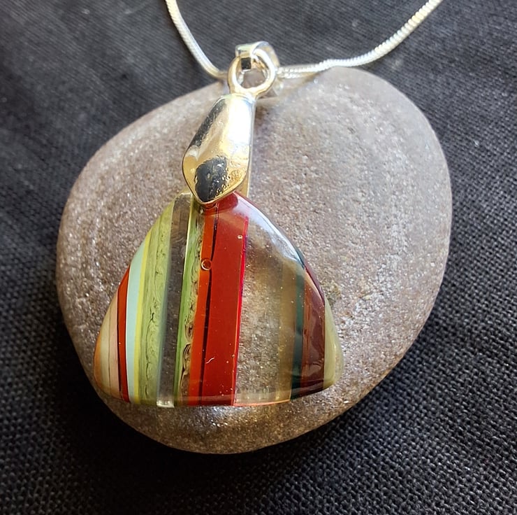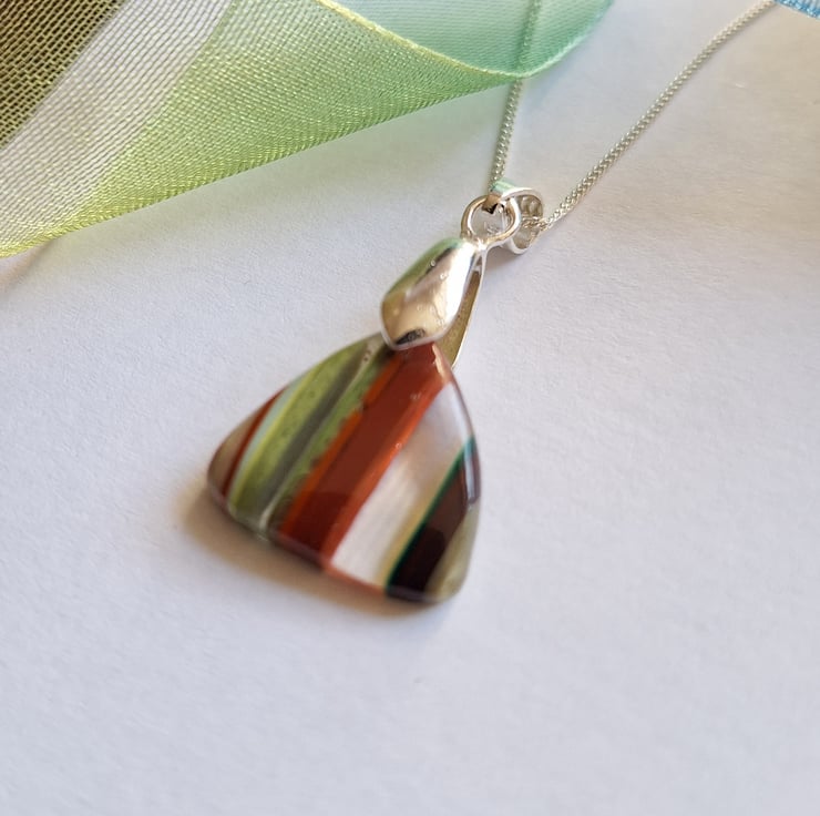 Beautiful little piece of surfite, with silver loops and chain. The surfite is approx 1.5cm and features stripes of brick red, green, clear and black.