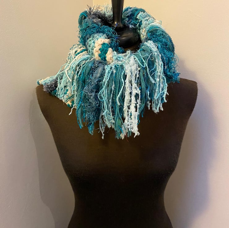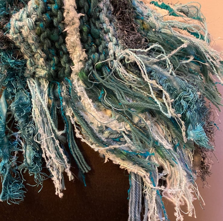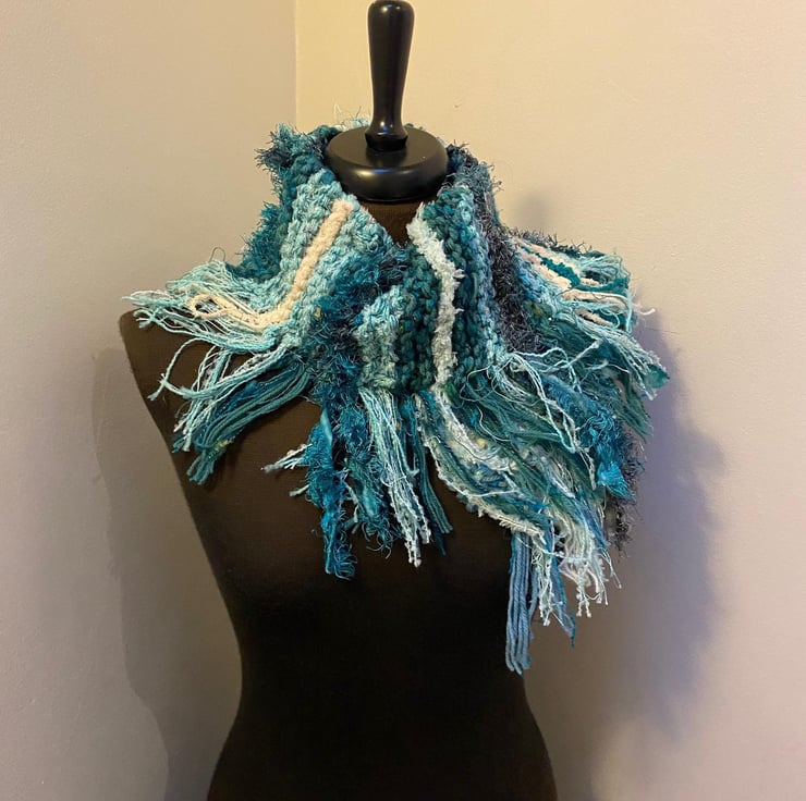 Wrap yourself in cosy style with this one-of-a-kind hand knitted scarf! Made with a stunning mix of yarns in ocean-inspired hues blue and white, turquoise, green and just a hint of sparkle this scarf is as unique as it is beautiful.